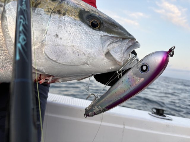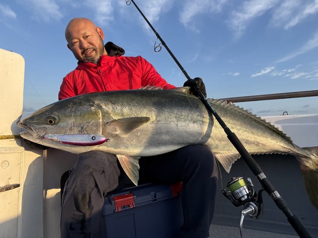 反対側で泳がせ用のムロを釣っていた仲乗りさんが、50mくらいでムロ取られちゃうから何かいるよ~ってことで、回収がてら50m付近を丁寧にしゃくるとひったくるようにヒット!!
