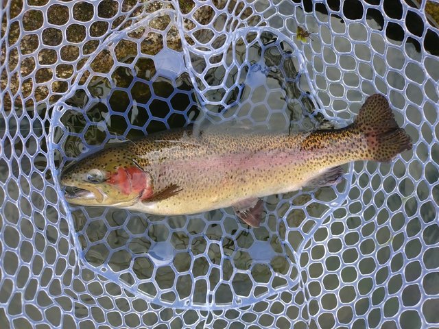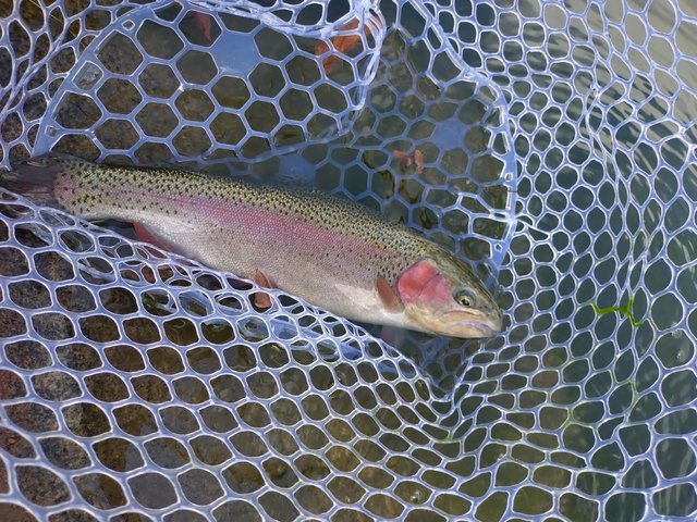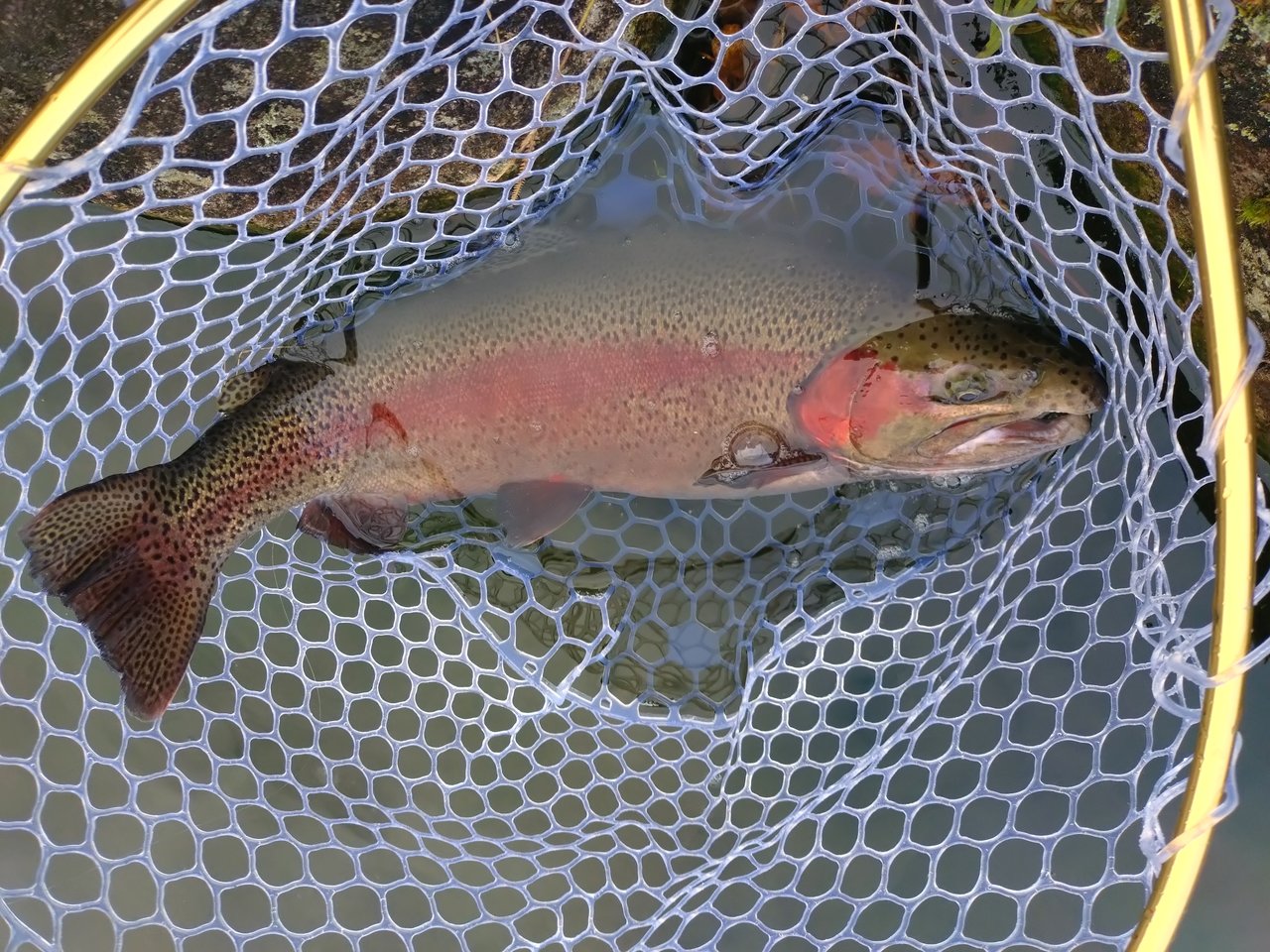朝から大物のいる3号池で釣りを始めました。フローティングラインで表層をリトリーブしましたが無風状態で表層の反応は全くなし。シンキングラインに変えて浅いところから徐々に深いところを探っているとゴンとアタリがありましたが、すぐにフックアウト。同じところを何回かリトリーブしているとまたもやゴンとアタリがあり、今度はフッキングしました。首の振り方と重量感から大物と確信し、慎重にやり取りしてようやくネットイン。厳ついオスの顔つきのニジマスをキャッチできました。後で測ったら58cmでした。その後はアタリが遠のいたのでポイントを変えて、手前にある石の裏側をゆっくりとリトリーブしたら、またもやゴンとアタリがあり、今度はメスの50cm程のニジマスをキャッチしました。