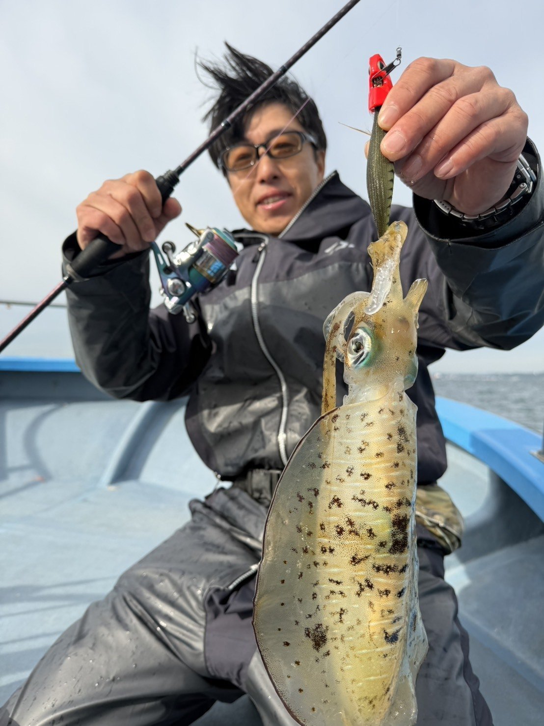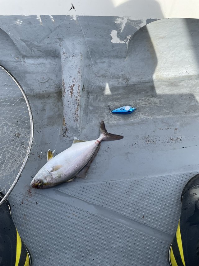 横浜港北店市川に誘ってもらい東神奈川バレントンさんからティップランへ行ってきました。天候は曇り、風はまずまずの好条件。竹岡沖からスタートです。始めてすぐは潮が早く30gのシンカー装着で釣りになる感じ。なかなかアタリは出ず何度か流し変えると市川にファーストヒット、流石です。続けたばかりに殺気ムンムンでシャクリましたが私にはアタリなし。やっぱり無の境地ですね(笑)
