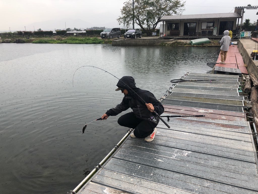 当日は生憎の雨模様、薄着で臨んでしまい寒くてぶるぶるでしたが、開始早々レギュラーサイズが釣れて寒さは吹き飛び一安心。