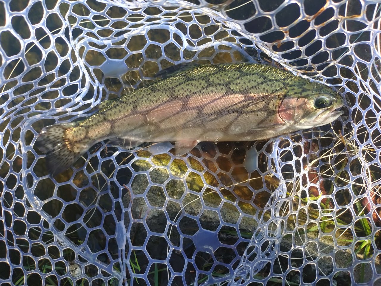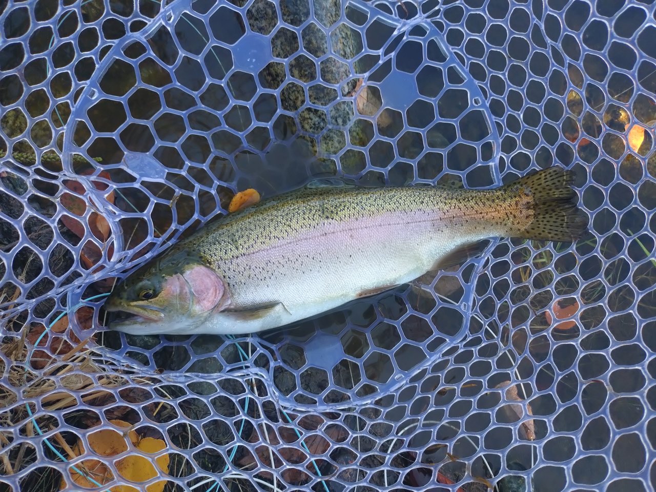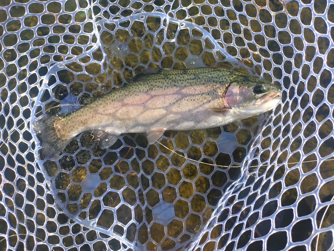 水はクリアで底の砂地もはっきり見えますが、魚の影はほとんどなし。ライズもなかったので、シンキングラインでキャストしましたが、1投目から根掛かりしフライをロストしました。ラインをインターミディエイトに変え何度かキャストしていると手前のところでもったりした重みがあったので合わせると、重量感のある手ごたえが伝わり大物が掛かったと確信。直後に沖に向けて走り出したので、バレないように慎重にやり取りして何とかキャッチしました。後で測ったら56cmの体高のあるニジマスでした。