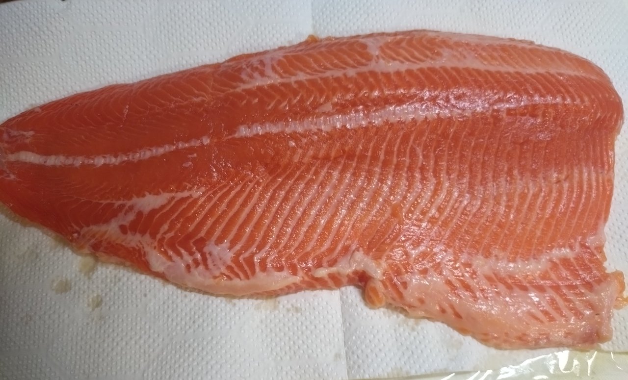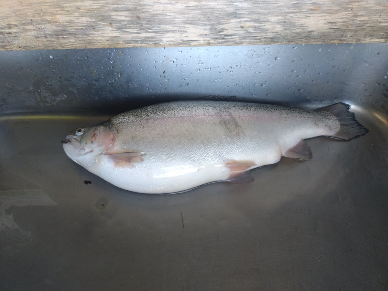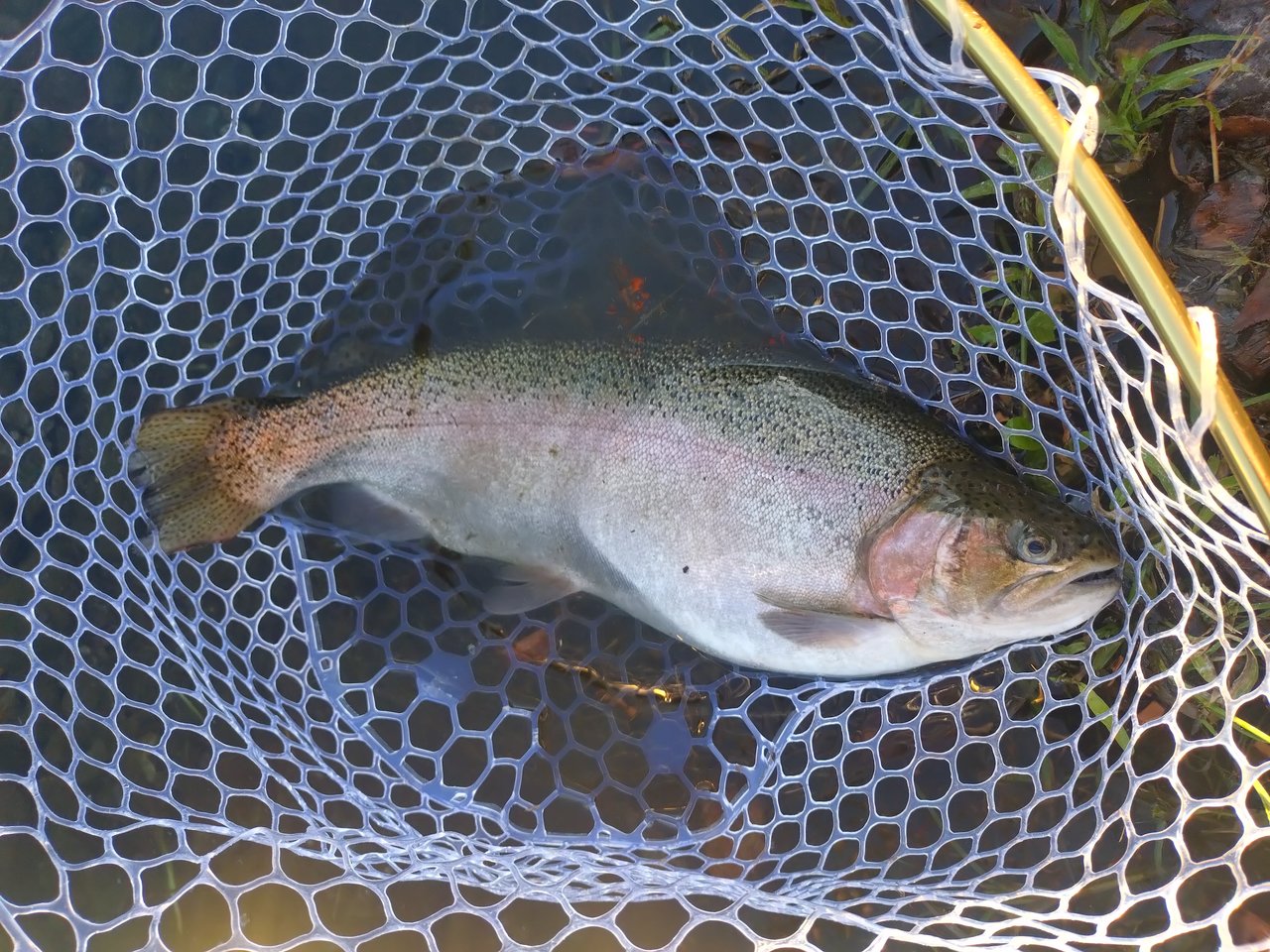 水はクリアで底の砂地もはっきり見えますが、魚の影はほとんどなし。ライズもなかったので、シンキングラインでキャストしましたが、1投目から根掛かりしフライをロストしました。ラインをインターミディエイトに変え何度かキャストしていると手前のところでもったりした重みがあったので合わせると、重量感のある手ごたえが伝わり大物が掛かったと確信。直後に沖に向けて走り出したので、バレないように慎重にやり取りして何とかキャッチしました。後で測ったら56cmの体高のあるニジマスでした。