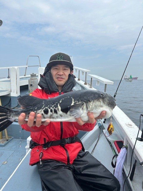 金沢八景忠彦丸さんから今人気のトラフグ釣りに行ってきました!出船前の船長のレクチャーを皆真剣に聞いており、釣りたいという気持ちがうかがえます。冨浦沖のポイントまではかなり時間がかかるものの、大型船でゆっくりくつろげて結構快適でした。冨浦沖では底の釣りで、船長のレクチャー通りゆっくりとした誘いをかけていると小さなアタリが!すこし様子を見ていると大きなアタリに変わりそこで大きく聞き合わせを入れ巻上げに。手巻きで最後まで慎重に巻上げ、1.1キロの小型をキャッチ。その後アタリも無くなり、久里浜沖へ移動。ここでは宙層の釣りに変わり浅いタナで誘っていると、お隣にヒット!すかさずタナに合わせると自分とその後ろでダブルヒット!その一瞬ではありましたがほかの方にもあたりが出ていたようで、その一瞬が本当に時合だったんだろうなという感じでした。その後はアタリも無くなりゲームセット。個人的には満足な釣りとなりましたが、船中で見るとなかなか厳しい釣果でした。これからますます激熱になってくると思いますので、是非チャレンジしてみませんか?!