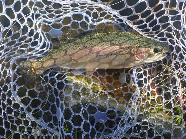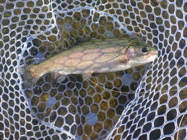 ポイントを少し変え、ライズも出始めたのでフローティングラインに変え、表層を探りながらリトリーブすると今度は明確なアタリがあり、40cm程のニジマスが釣れました。その後11時過ぎくらいまでアタリはほとんどなかったので、アウトレットのところに移動しました。