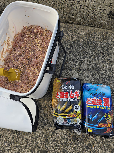 今回は釣場の水深も棚取りおもりで取りながらの実釣スタート。付け餌は新製品のアミノⅩオキアミです。短時間なので撒き餌を多めに投入した後に仕掛けを投入する。撒き餌の銀狼アミノXチヌど遠投ムギが水中をパラパラと落下しているのを見ているとウキがモゾモゾっと沈み魚信をキャッチ!!銀狼ロッドを起こすだけで合わせは入れずにチヌの引き味を楽しみながらキャッチしたのは綺麗なチヌさん。その後も連荘で2匹追加したタイミングで雨が本降りになり納竿。手軽に楽しめるチヌの堤防フィッシングは楽しいので是非、チャレンジして下さいね。