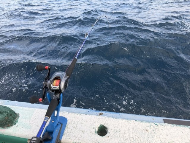 大型が回っているのを確認でき、無我夢中でシャクっていると自分にもヒット!ショゴサイズのヒレナガカンパチをキャッチ!