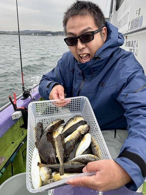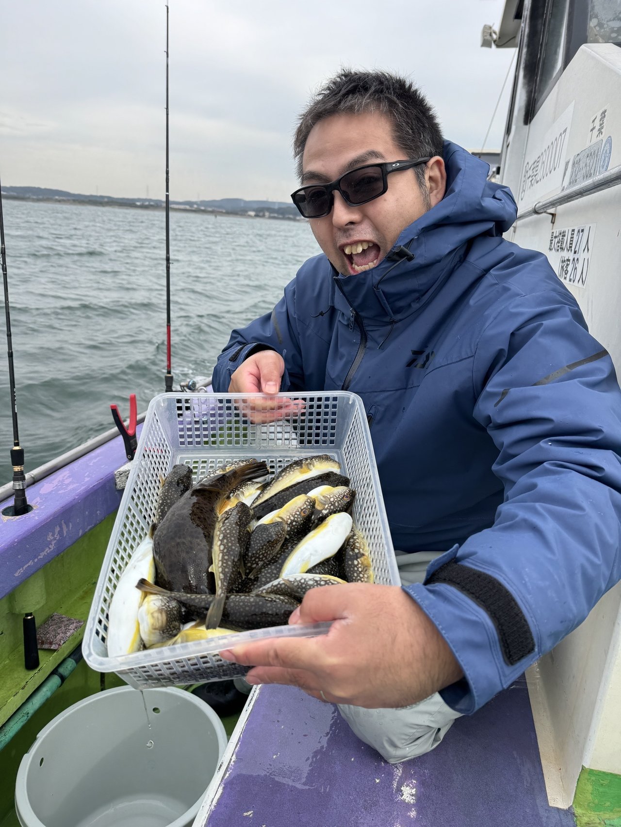 今回は珍しくボッチ釣行ではなく、初挑戦の喰わせフグを勉強するべく南行徳店の水野大先生を強制連行し富津の川崎丸さんへ行ってまいりました!開始は自前の竿でやっていましたが途中経過で私→5大先生→20と大差をつけられます!隣で私のバケツを見て先生の一言、『頑張んないと…。』とプレッシャーのかかる一言を頂きポイント移動もあったのでここで借りた竿にチェンジ!その後はコツ?!みたいなものを掴みだし、バラシも激減し連発開始!専用竿はやはり違います!終了時間が近くなってきたのでエサも無くなったことだしそろそろしまうかなっと撮影係になろうかなと思いましたが先生からエビを渡され釣りなさい!と指令が発令!ここでさくっとダブル!先生、私やりました!やればできるんです!今回の釣行で水野大先生からは色々と教わり勉強になりました!また行きましょ!