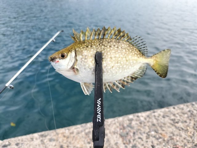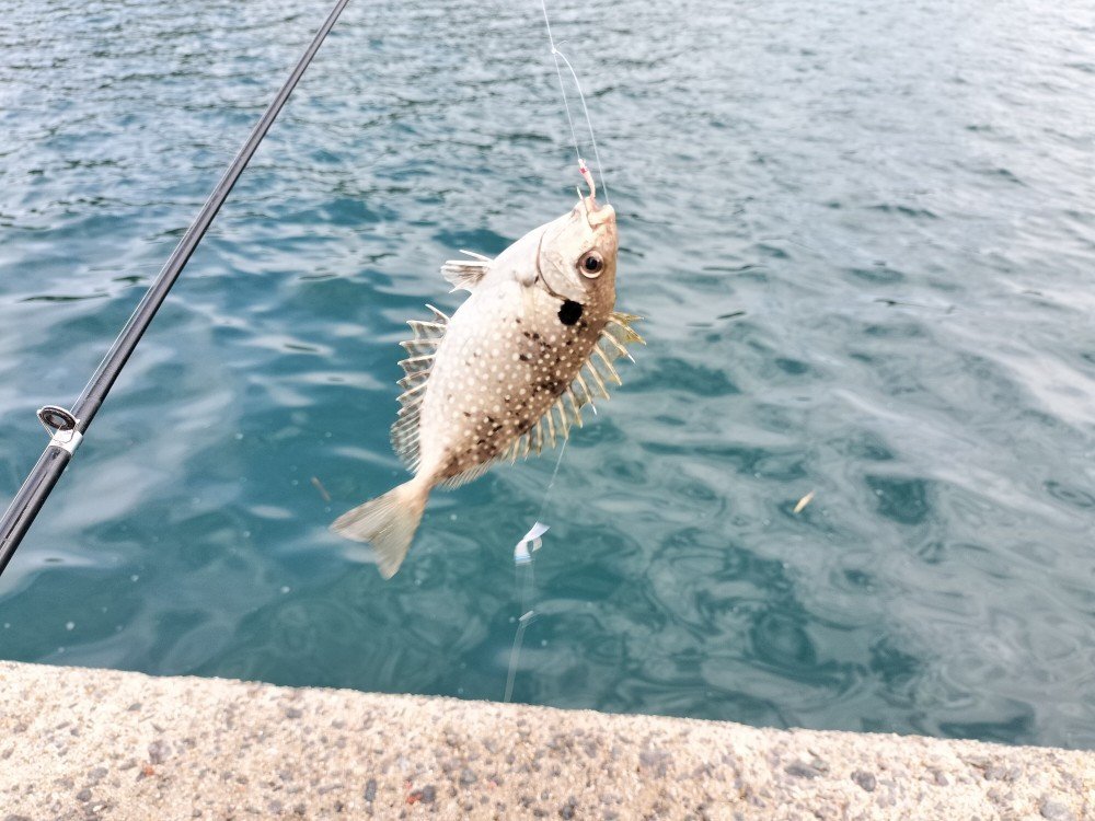アジっぽい魚影が見えたのでサビキ投入するとなんとも痩せた海タナゴ。
