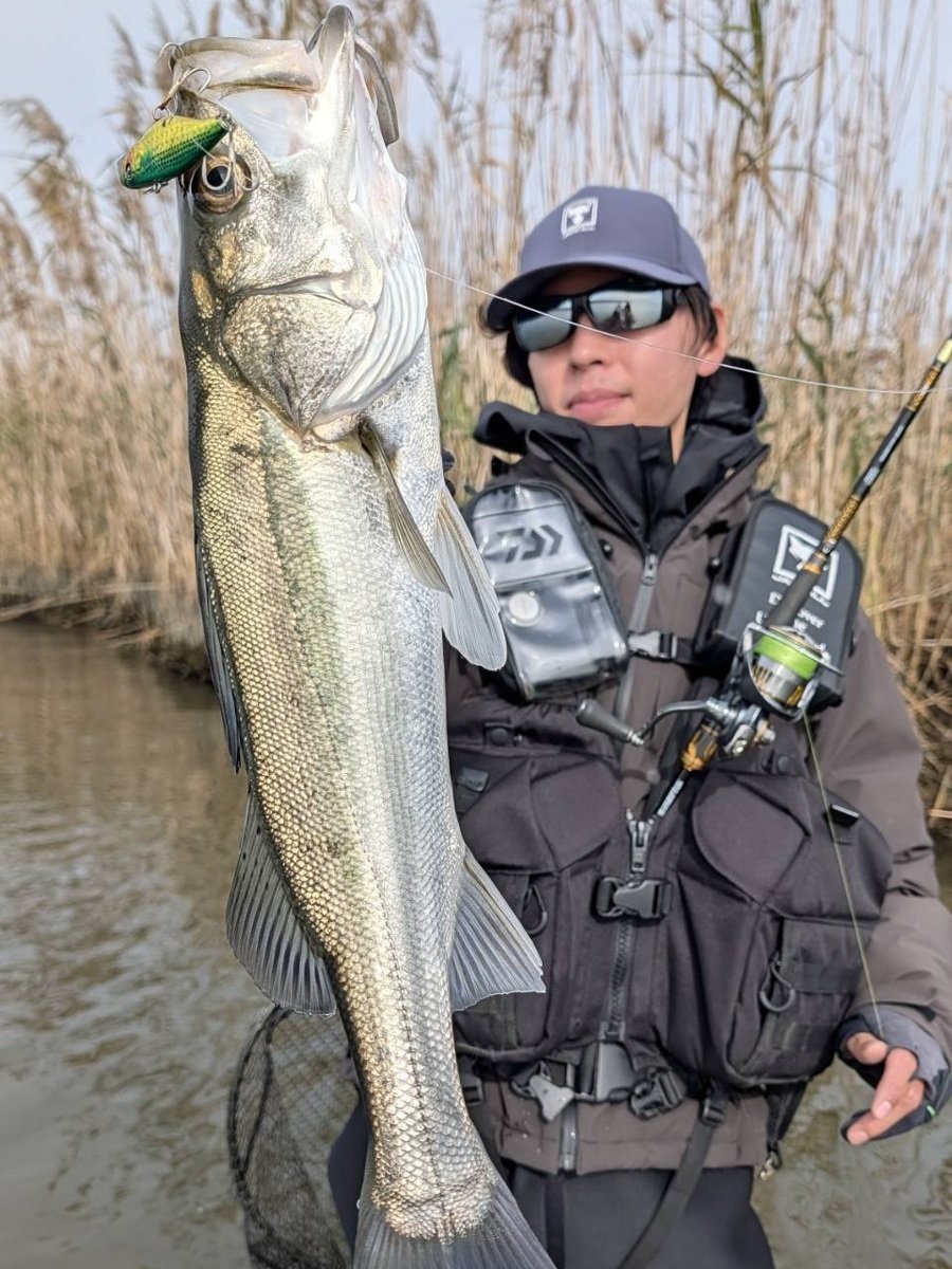 寒空の晴天の下ちょっと大きめのトップルアーにバイトする