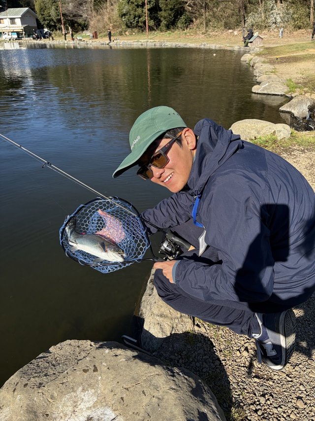 その後は、リリース池でドクターミノーなど用いて5匹ほど釣り、日が落ち始めた16時頃から一段と寒くなったので終了しました。