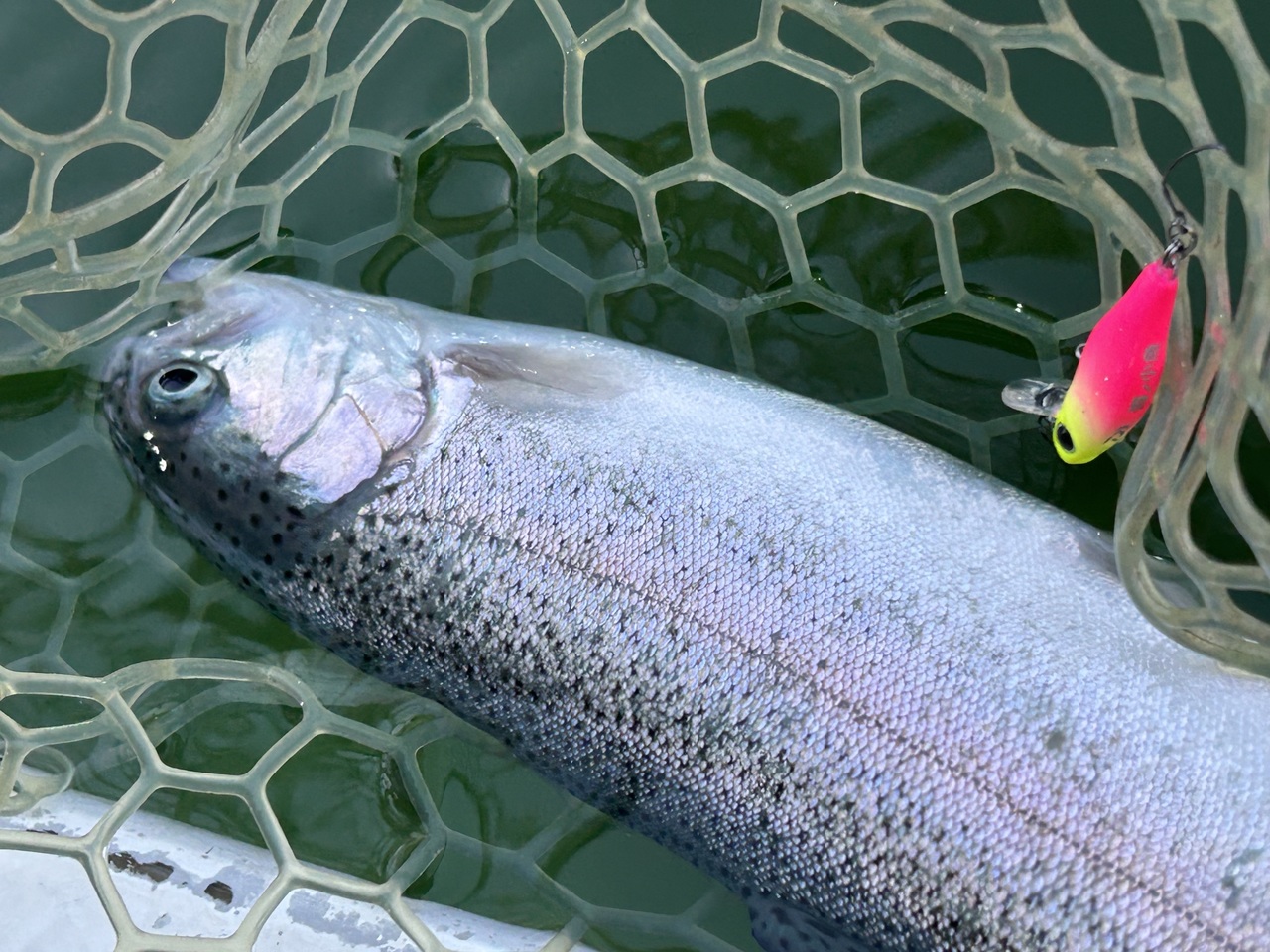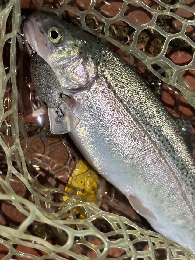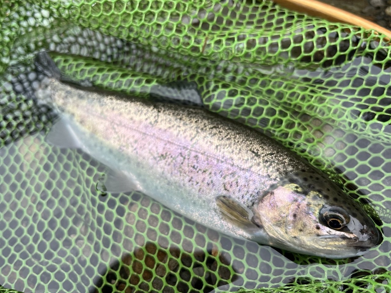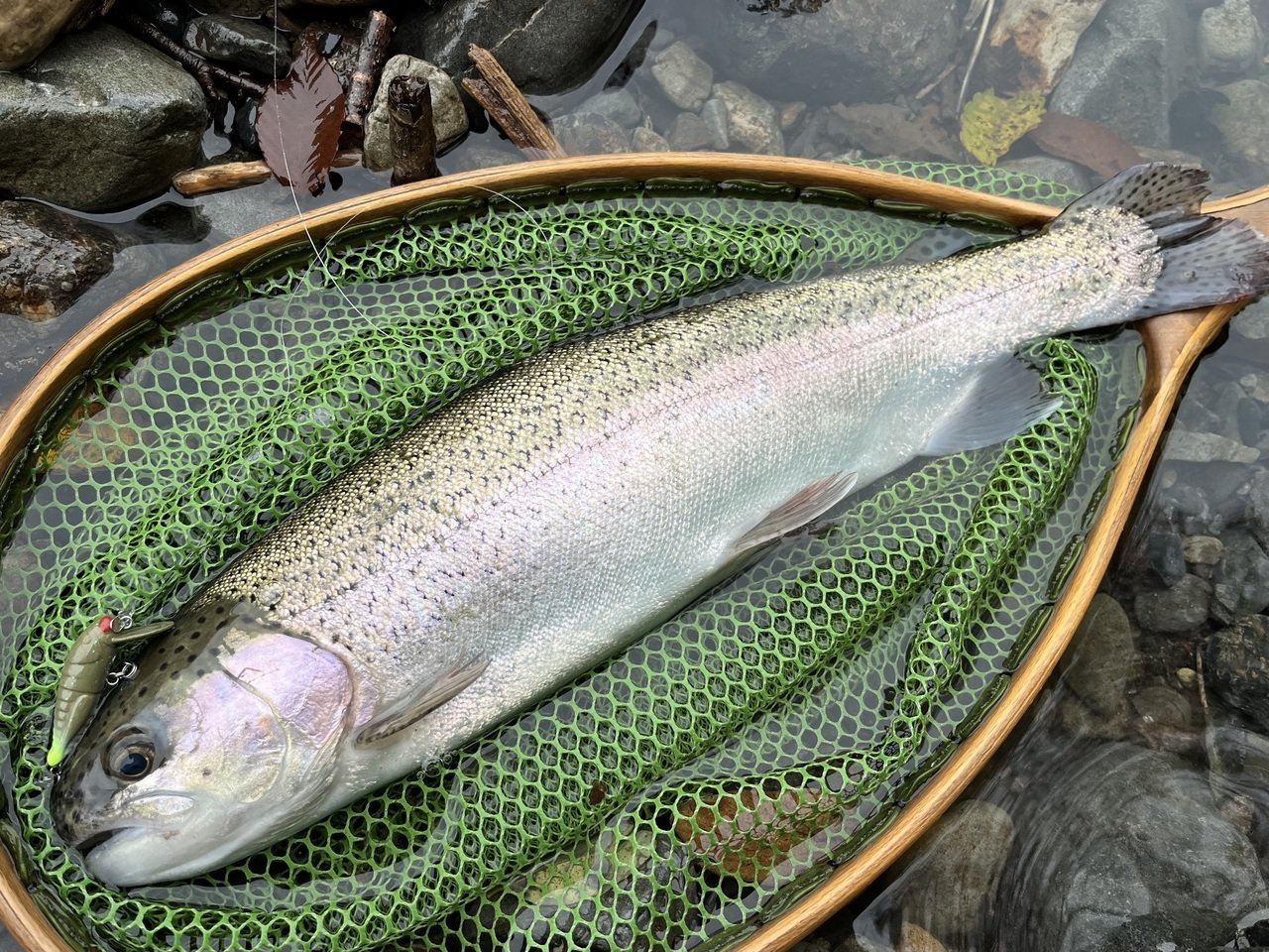大型の魚が反応が良く、上野村で鍛えた鼻先テロテロトレースでガブっと一閃。40cm程のニジマスをキャッチできました。