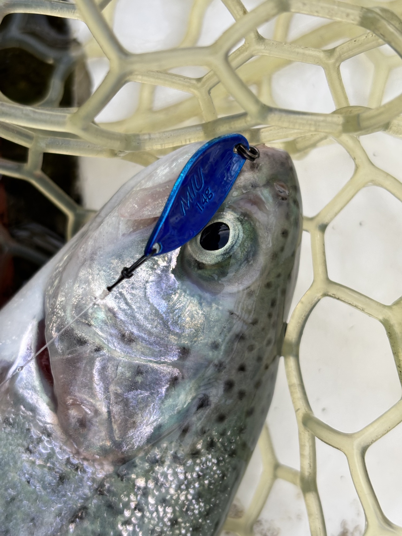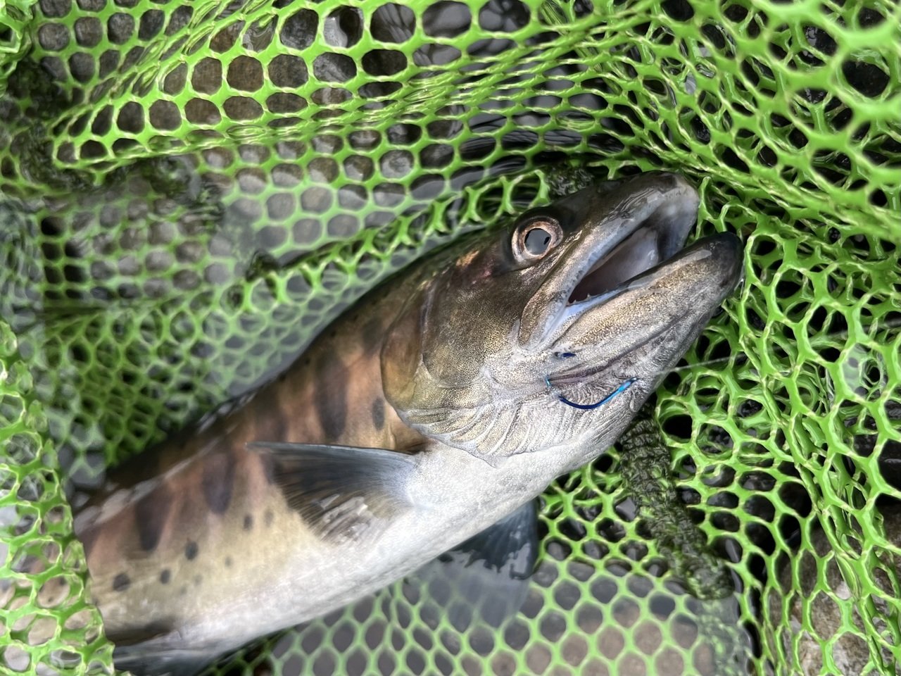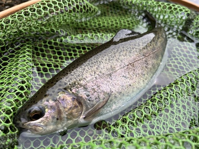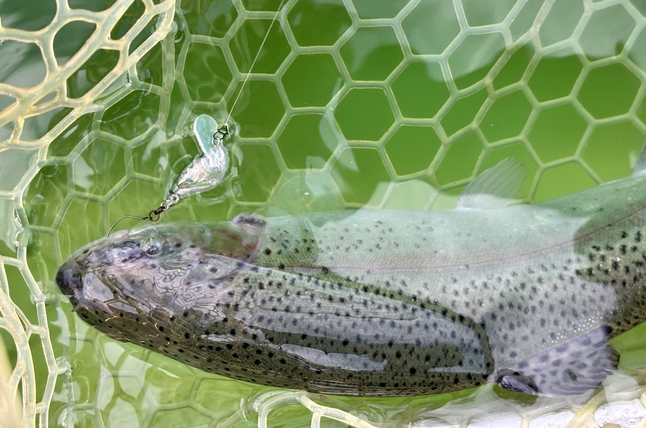 大型の魚が反応が良く、上野村で鍛えた鼻先テロテロトレースでガブっと一閃。40cm程のニジマスをキャッチできました。