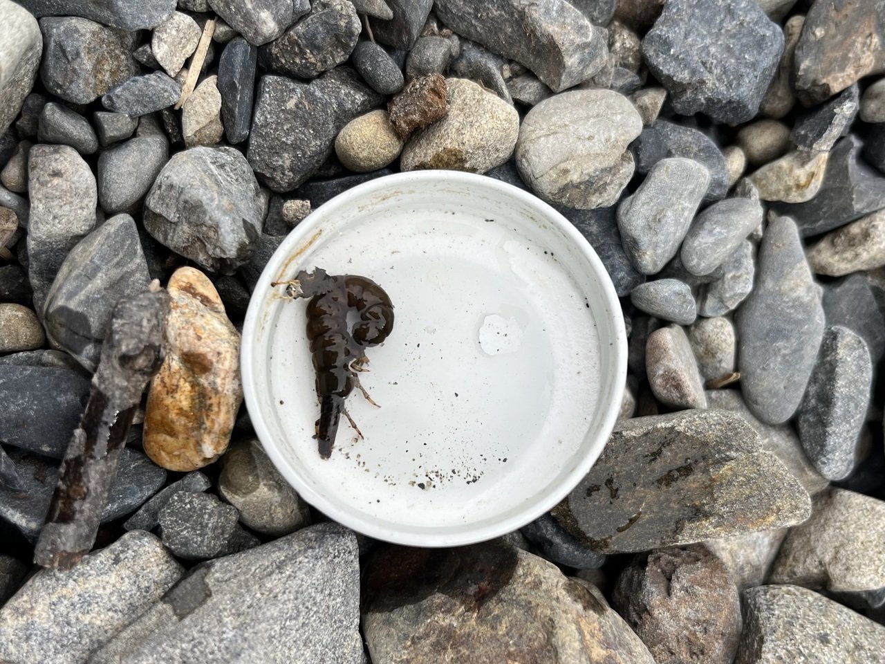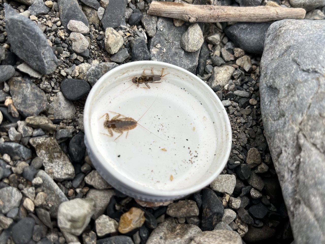 砂利をほじくり、時期的に厳しいもののなんとかヒラタとクロカワムシを確保したので早速針につけて流してみます。