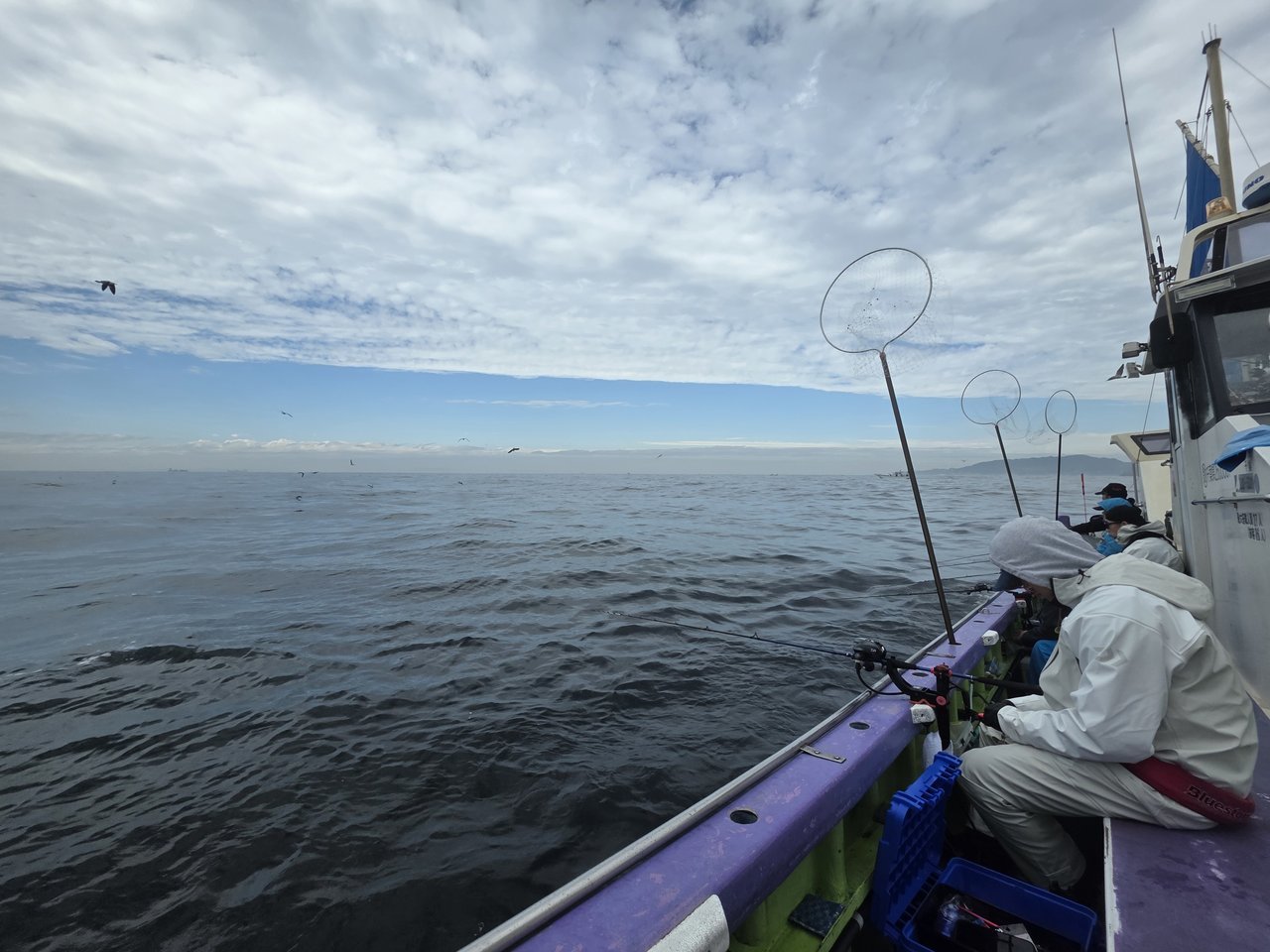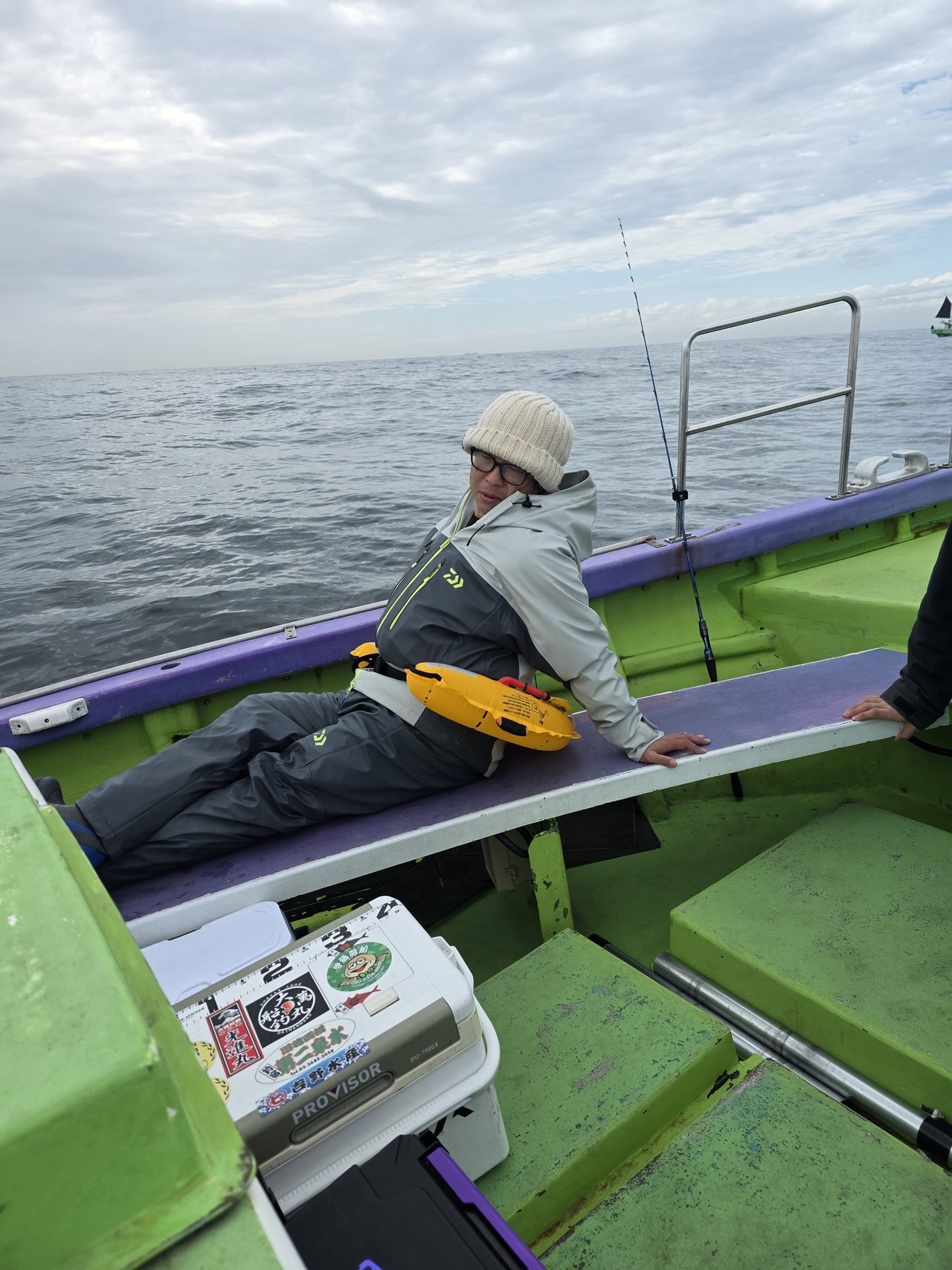 当日はあいにくの雨と南西風15mで海は大荒れ。釣り場に到着するまでに2時間半以上かかる厳しいコンディションとなりました。私自身も船酔いでダウンしてしまい、改めて海の厳しさを痛感しました。