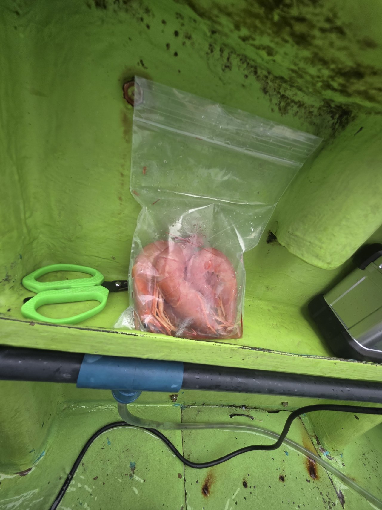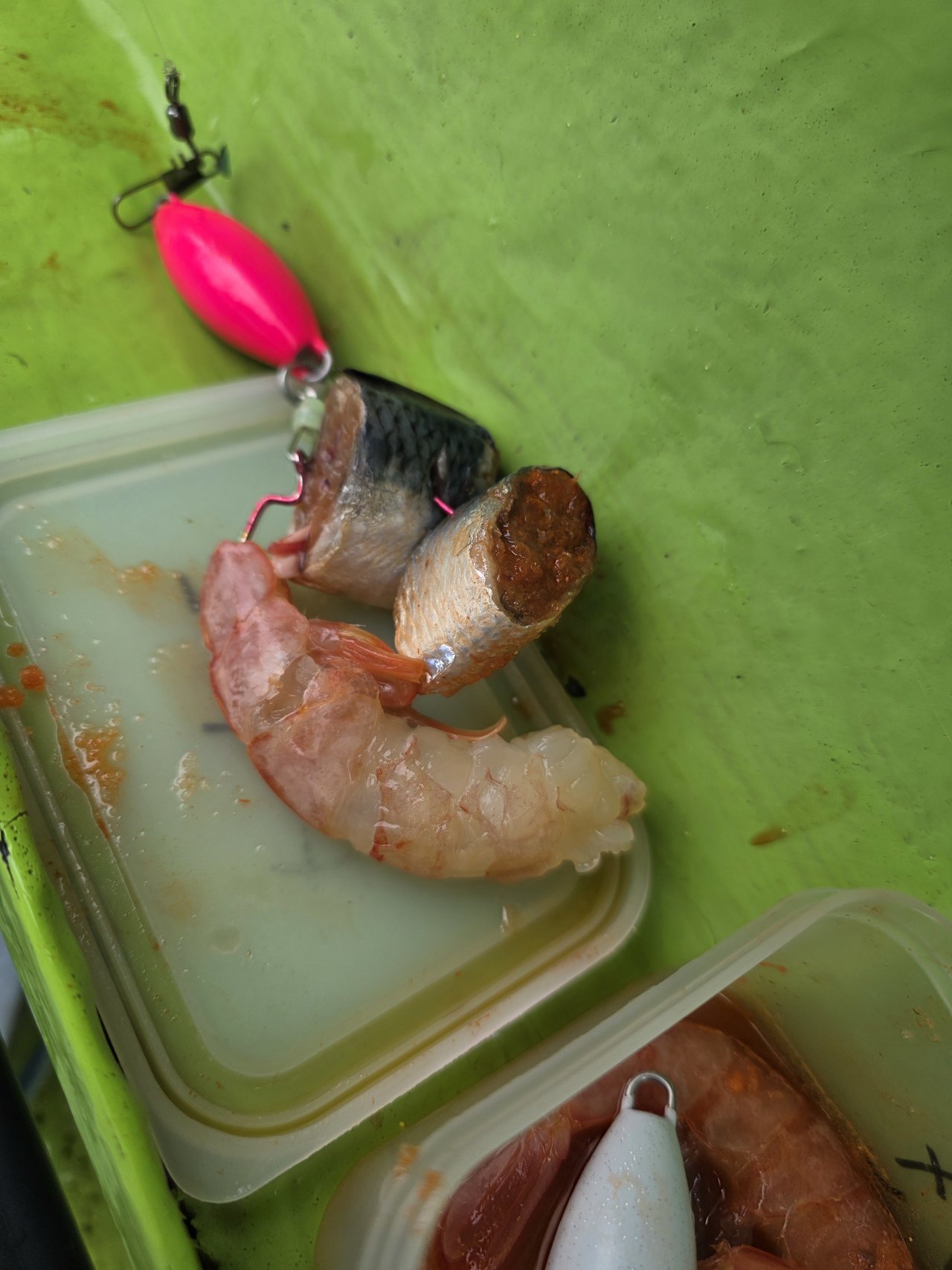 海況が落ち着いてから実釣スタート。エサは船宿から支給されるエビを使用しつつ、参加者の中にはアオヤギやホヤ、イワシなどを持参して工夫されている方も多く見られました。仕掛けは30号をメインに、潮の状況に応じて40号を使用。この日はほとんどが30号指定となりました。