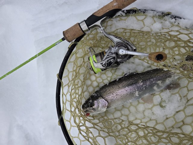 過去にエリアでボウズだった以来、数年ぶりのエリアトラウト。楽観して軽~い気持ちで行きましたがエリアの難しさ思い出しました!手慣れた文屋さんがテンポ良く釣る中、乗せられず、バラすの繰り返しで実力差、タックルの差を痛感致しました。久しぶりにガイドが凍る寒い中の釣りも楽しいものです。