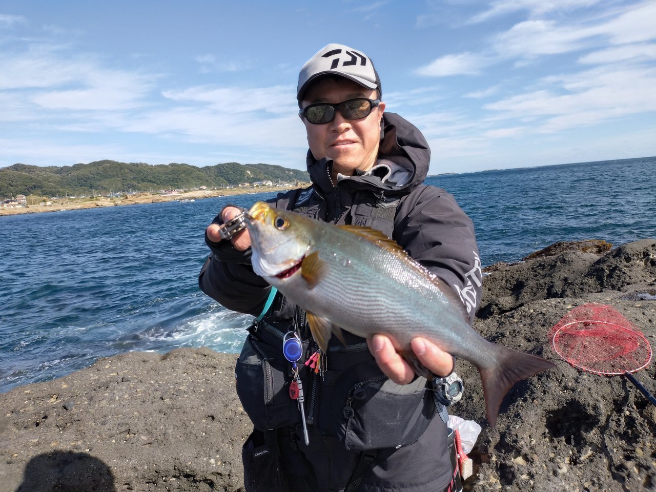 10時半ころに場所を変わり、釣れていた状況ポイントを教えてもらい、釣行再開しますが、コッパの猛攻は変わらず苦戦します。エサ取りの猛攻を回避し、仕掛けがしっかりなじませられると、シマアジが釣れます。ちょっとポイントを変えて、少し手前に投入し目の前のアシカ島との間を流してみると、ウキが勢いよく消し込み、今日一の引きを堪能します。浮き上がったのは良型イサキでした。