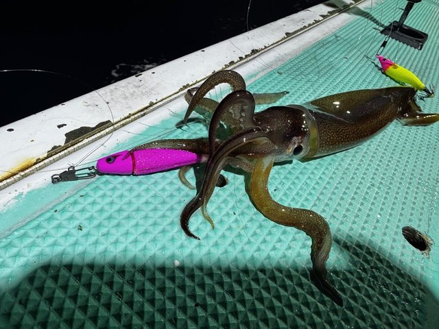 当日はイカジグやスッテをしっかり動かすとスルメが、軽めのスッテをスローフォールやシェイクなどで細かく誘うとヤリが釣れるような感じ。