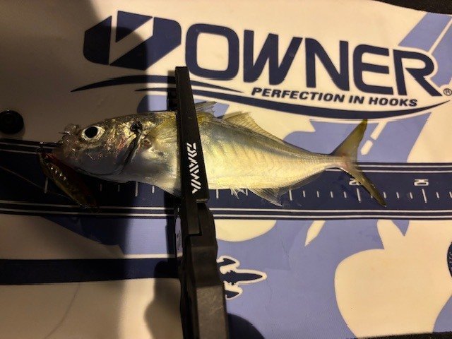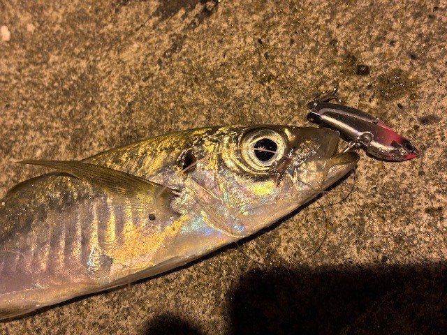 大潮ド干潮スタートだったので水深超~浅い!とりあえず何か釣りたいので、コアマンのIP-10アイアンプレートで明暗ラインを巻き巻き。カマスは不在。アジは20cm超えでなかなか引きが強く楽しめました♪時合いが終わるとパッタリ釣れなくなったので、釣れたアジで泳がせ釣りをしてみることに。ドレスのアヒルちゃんフロートを使用。アジがデカすぎなのか目的の青物は釣れませんでしたが、アヒルちゃんがプカプカ泳いでいるのを眺めているだけで癒されました♪また調査に行ってみます!!