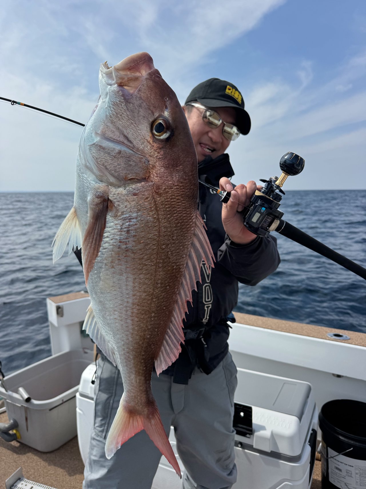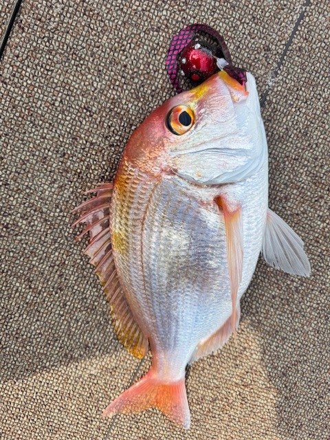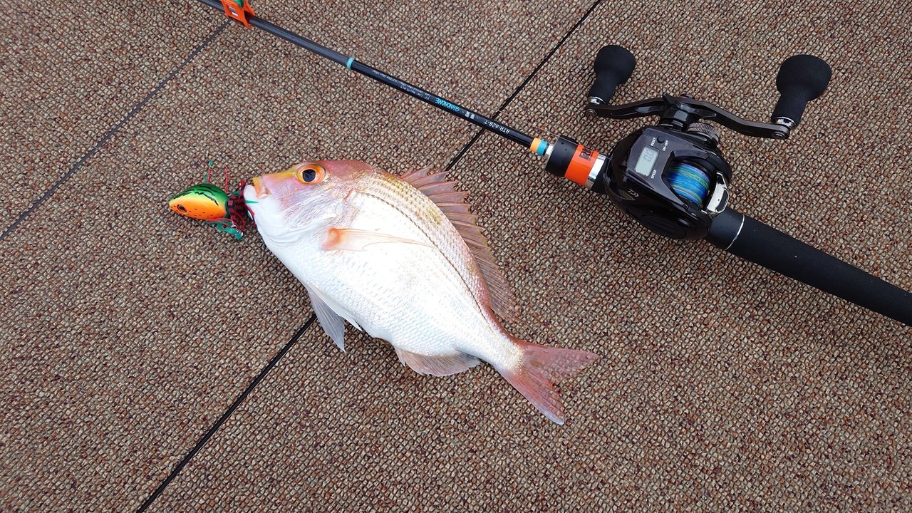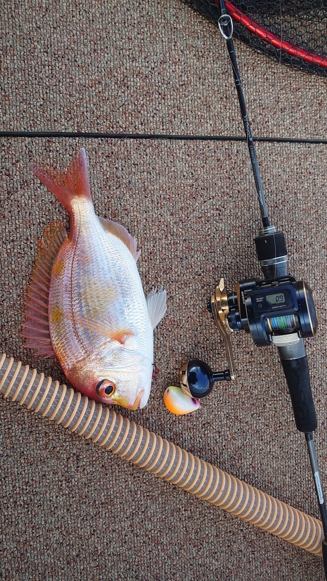 何とか底を取りながら1時間程やっているとアタリが来ましたがドラグはでず。。。本命のマダイではなくレンコダイでした。。。その後ポイントを変えつつ2時間後カウンターを150程で底を取って巻き始めた瞬間にHIT!そのままのスピードで巻いているとドラグが!竿をブチ曲げながら150mを巻き上げ何とかばらさず初めて本命のマダイを釣り上げられました!
