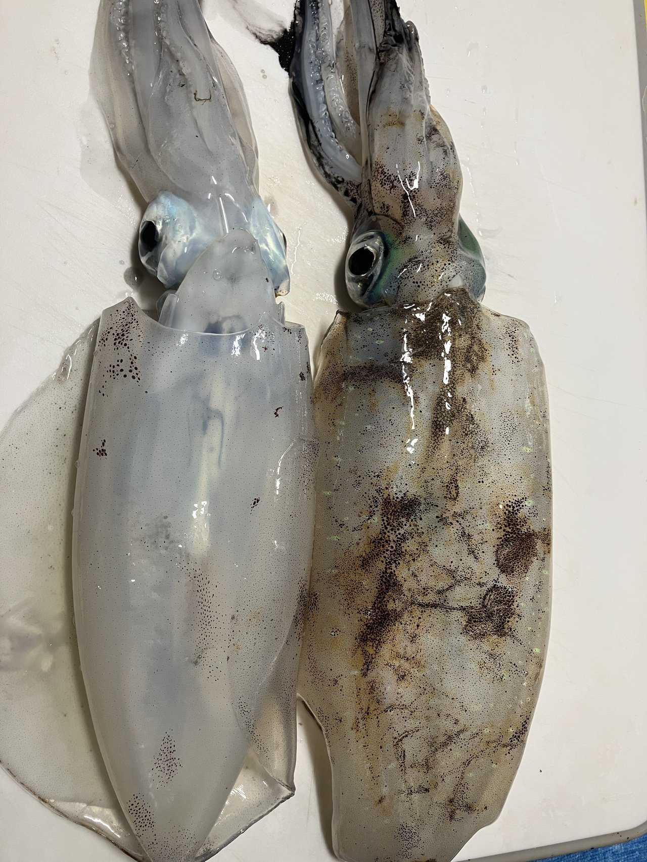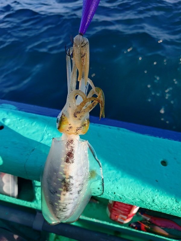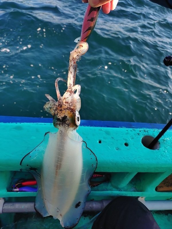 この日はかなり調子が良い日だったようで、必死のパッチでシャクリ続けた私はアオリイカ4杯、モンゴウイカ1杯の釣果。これだけ釣れれば満足なのですが、隣で釣っていた宮崎さんはアオリイカ8杯と絶好調でした。