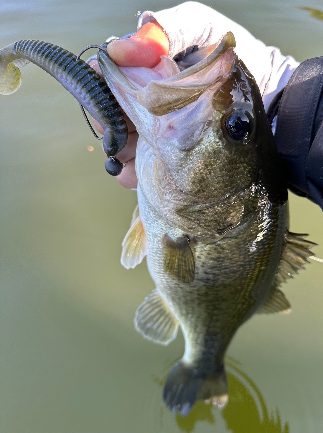 水温も暖まってきたからか、時折見える泳ぎ回っていた特大サイズが中層でボーとしている姿がわずかに見えた為、ルアーを目の前に巻き下げていくとコツンと小さいアタリが!