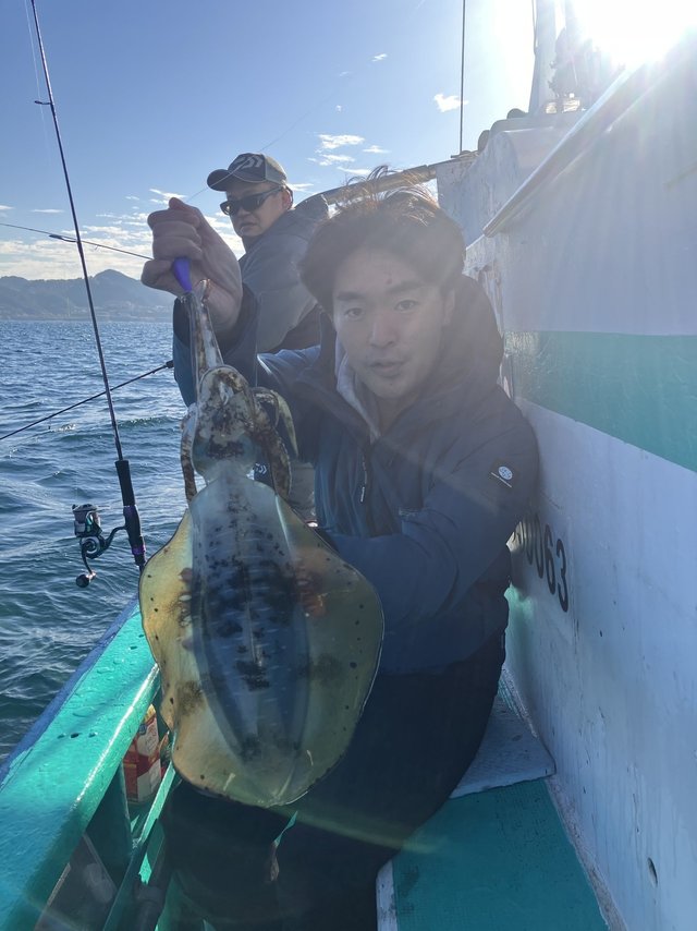 たまに300gくらいのサイズも釣れますが、船内で釣れるのはほとんど0.8kgくらいの良いサイズでした。ティップランエギング、最高の釣り。