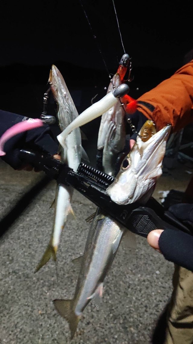 脂のりのり激旨カマスを求めて再度カマスゲームに行って来ました。今回は福岡店スタッフの中西さんと鬼頭さんもご一緒で早速現地で合流しゲームスタート☆序盤からぽつぽつアタリ時合いになると1投毎に3~5バイトあるなか中々乗らない状況に横で釣ってる中西さんも鬼頭さんも独り言が増える(笑)そーなんです!カマスって当たっても乗らない事が多いんです!乗せるコツはしっかりロッドにカマスの重みが乗るまで我慢して巻き続ける事☆それとルアーの後ろを着いて来て足元でアタる事も多いので堤防際までしっかり泳いでくれるルアーがこのゲームを成立してくれます。更にカマスのくちびるって特に先端は石の様に硬い作りになっているので貫通力のある針も重要!毎回釣行前には一軍ルアーの針全て交換してますよ!今回インクスレーベルさんから発売されているバーブレストレブルフック「トラスティンBL-35」を試しに使用してみましたがアタッた瞬間の貫通力は最高でしかも返しが無いバーブレスなので手返しも良き!これは一軍入りのアイテムですね!(^^)!