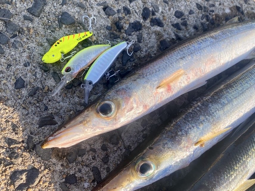 脂のりのり激旨カマスを求めて再度カマスゲームに行って来ました。今回は福岡店スタッフの中西さんと鬼頭さんもご一緒で早速現地で合流しゲームスタート☆序盤からぽつぽつアタリ時合いになると1投毎に3~5バイトあるなか中々乗らない状況に横で釣ってる中西さんも鬼頭さんも独り言が増える(笑)そーなんです!カマスって当たっても乗らない事が多いんです!乗せるコツはしっかりロッドにカマスの重みが乗るまで我慢して巻き続ける事☆それとルアーの後ろを着いて来て足元でアタる事も多いので堤防際までしっかり泳いでくれるルアーがこのゲームを成立してくれます。更にカマスのくちびるって特に先端は石の様に硬い作りになっているので貫通力のある針も重要!毎回釣行前には一軍ルアーの針全て交換してますよ!今回インクスレーベルさんから発売されているバーブレストレブルフック「トラスティンBL-35」を試しに使用してみましたがアタッた瞬間の貫通力は最高でしかも返しが無いバーブレスなので手返しも良き!これは一軍入りのアイテムですね!(^^)!
