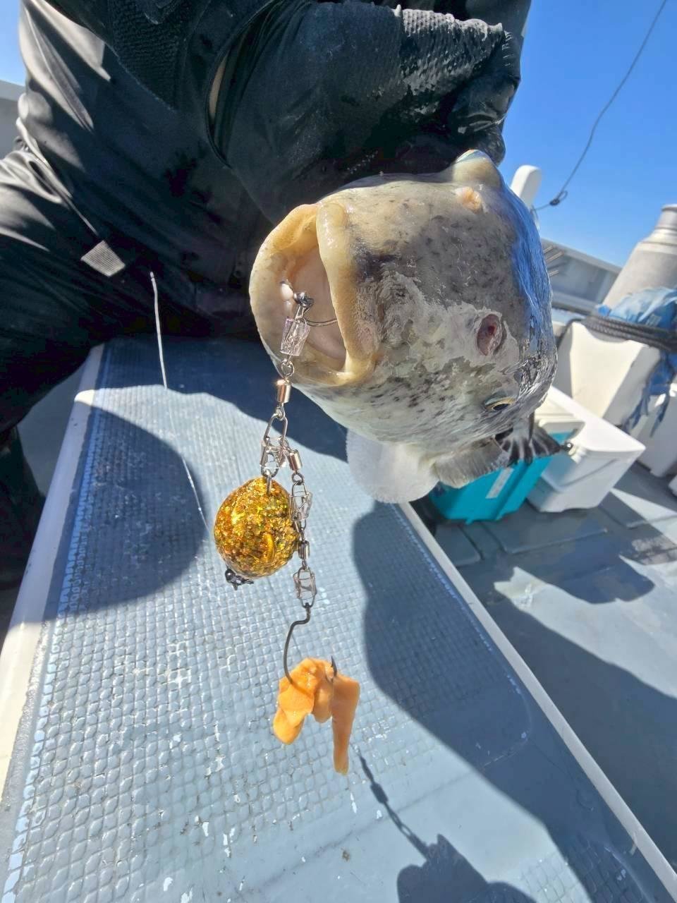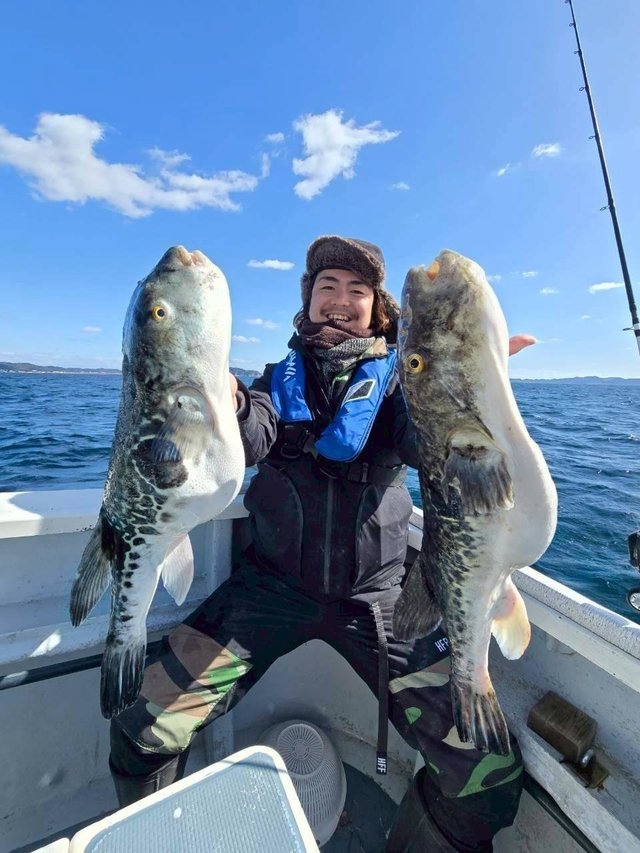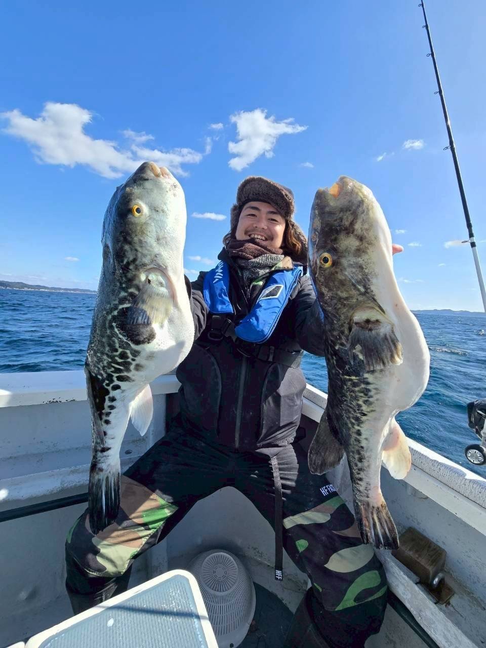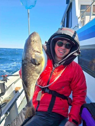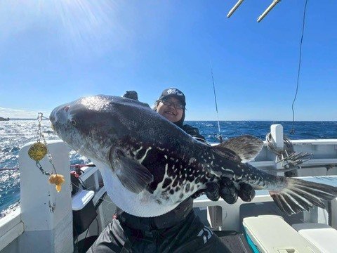 それからしばらく沈黙が続きましたが、三木さんに待望のHIT!釣り上げた直後ハイブリットと思いきや、船長に聞くとまさかのマフグ。そしてその後、阿左見さんが覚醒。1匹目のキロアップをGET&白子確定演出を出してから、エサが底を尽きますが、分け与えたイワシ餌でダメ押しのサイズアップ!(確定演出無しでしたが、捌いたら白子たっぷりの大当たり)ラスト1時間で私は数度アタリが出るも続かず掛けられないまま終了。この日は船中6匹、0~2と厳しい結果ではありましたが、これからが期待できる結果となりました。