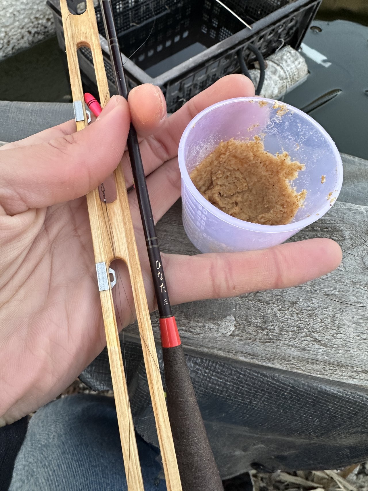 エサを練り、竿に仕掛けを付け伸ばし、小さな針にエサを付けて釣りスタート!
