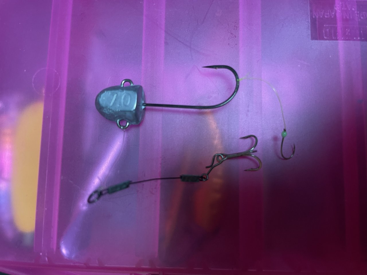 何故かケースに入っていた鬼爪を付けるもフッキングしないため、面倒くさいけどリーダーとルアーからフック移植で作るかぁ~。と作業を始めると足元に捨てられた?落として無くした?ヒラメシャフトを発見!ボロボロだけど使えると判断し、ありがたく拝借(笑)