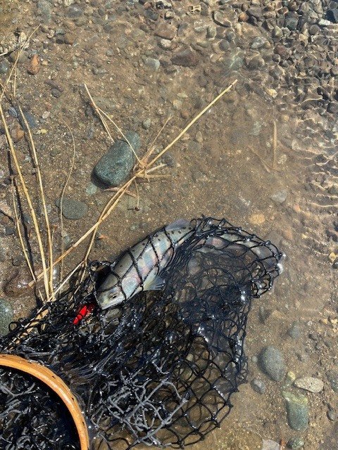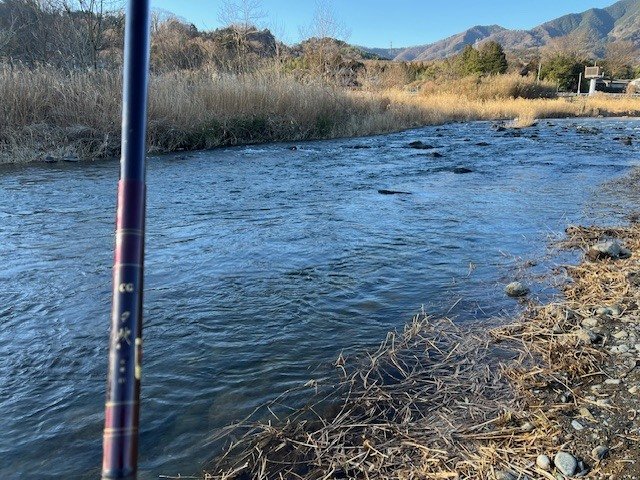竿をルアーロッドに持ち替えて再チャレンジです。ルアーはお気に入りのチヌーク4.5g金。そして数投目で待望の2026年初ヒット&キャッチ。一安心したところで再度餌釣りに変更しますが、鮎と違って現場でも比較的簡単に仕掛けが作れるので助かります。放流ポイントに入りますがどうしても食わせることができません。またルアーマン、フライマンの方が入れ替わり立ち替わり入りますが釣れるのはルアーマンのスプーンやミノーだけでした。ということでまたまた竿を持ち替えてチヌークゲキアツ7g赤金を投げるとすんなり2匹目がヒット。リアクションが有効なのでしょうか?その後はミノーやスプーンにアタリや追いはあったものの食いが浅くヒットまでには至りませんでした。