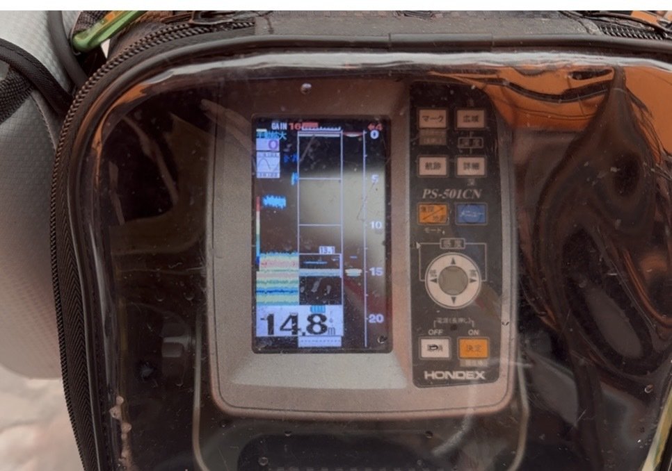 一緒に釣行した後藤さんの魚探にはそこから1mはビッシリ反応があるのですが、僕の魚探は底から1.5mにチラホラ・・・。掛けあがりの真ん中にテントを立てたようです。