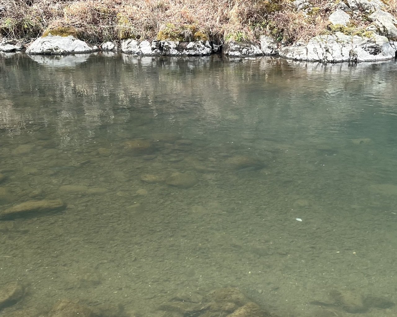 水温は9℃、水量はやや少なめ、薄濁りのコンディションでした。