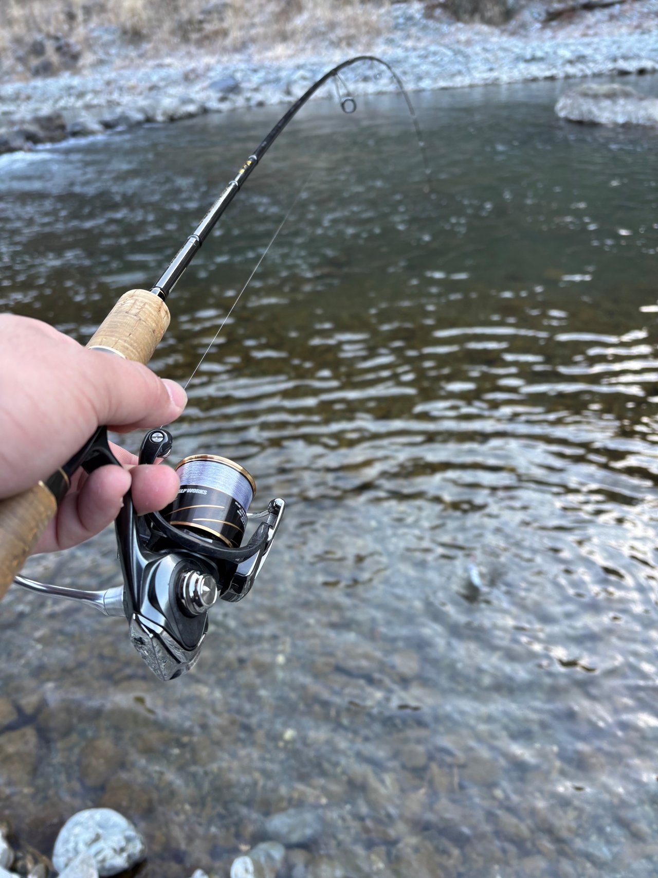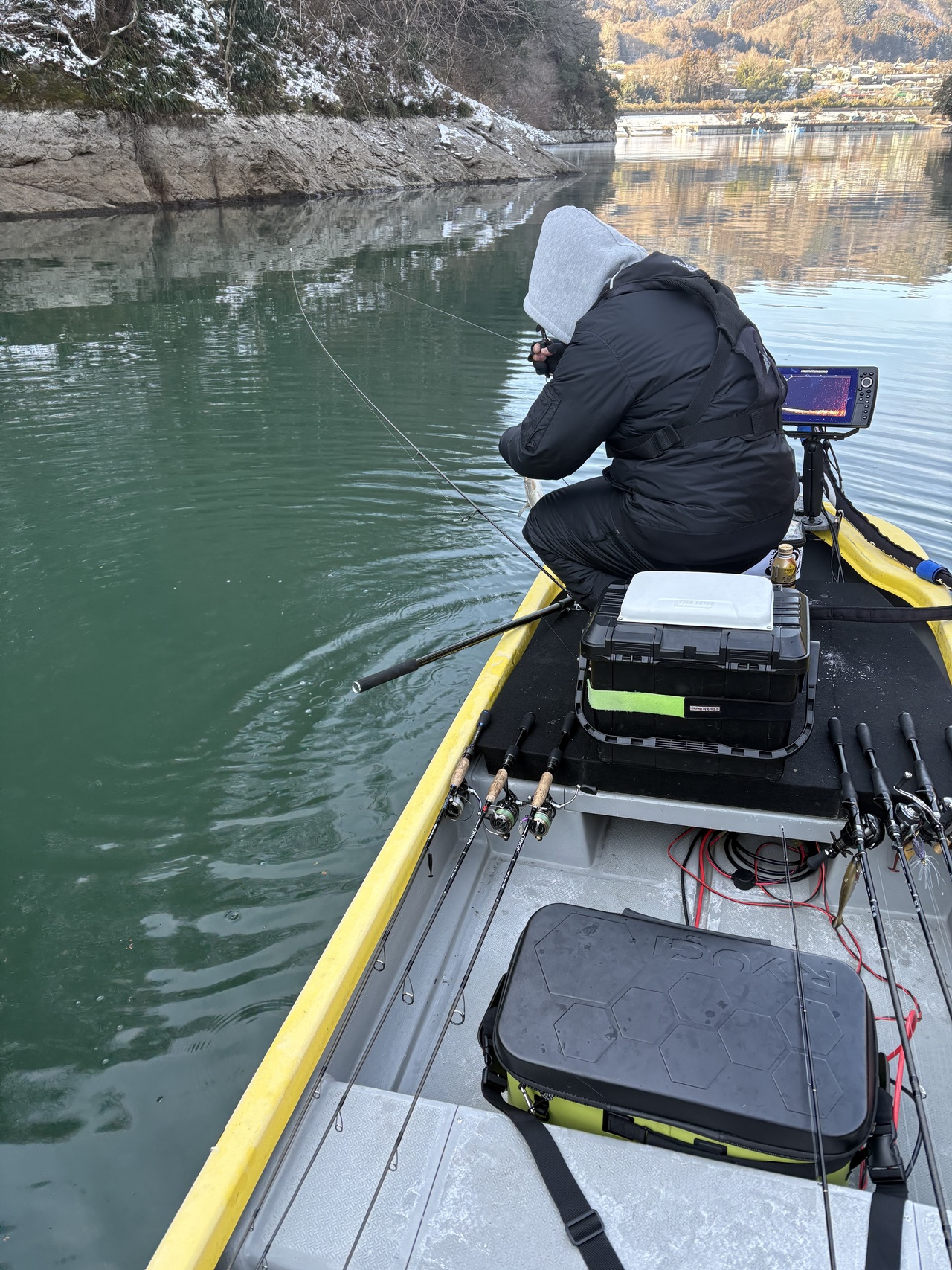 朝一からスタートするも気温が低いでガイドが凍ることが多く大苦戦…ルアーを巻く手もかじかむので体をあっためるために操作系のボトムの釣りに早々にチェンジするとなかなかいい感じでした。