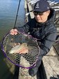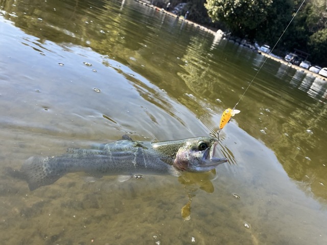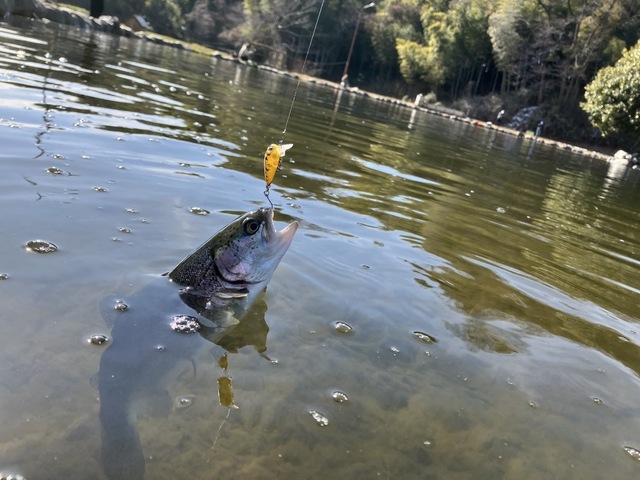 今回はイチロー池で実釣。表層にトラウトが浮いているものの上空からの鳥を警戒しているからか表層での反応はイマイチ。ボトム狙いに変えるとぽつぽつレギュラーサイズが釣れました。