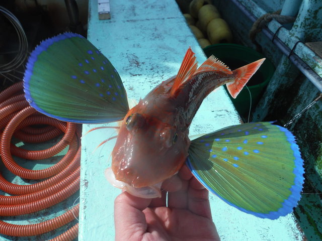 同船した方はマハタやカサゴ等の根魚が釣れ、私はフグと大原ではめっきり見なくなったホウボウが釣れて終了となりました