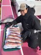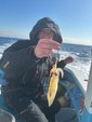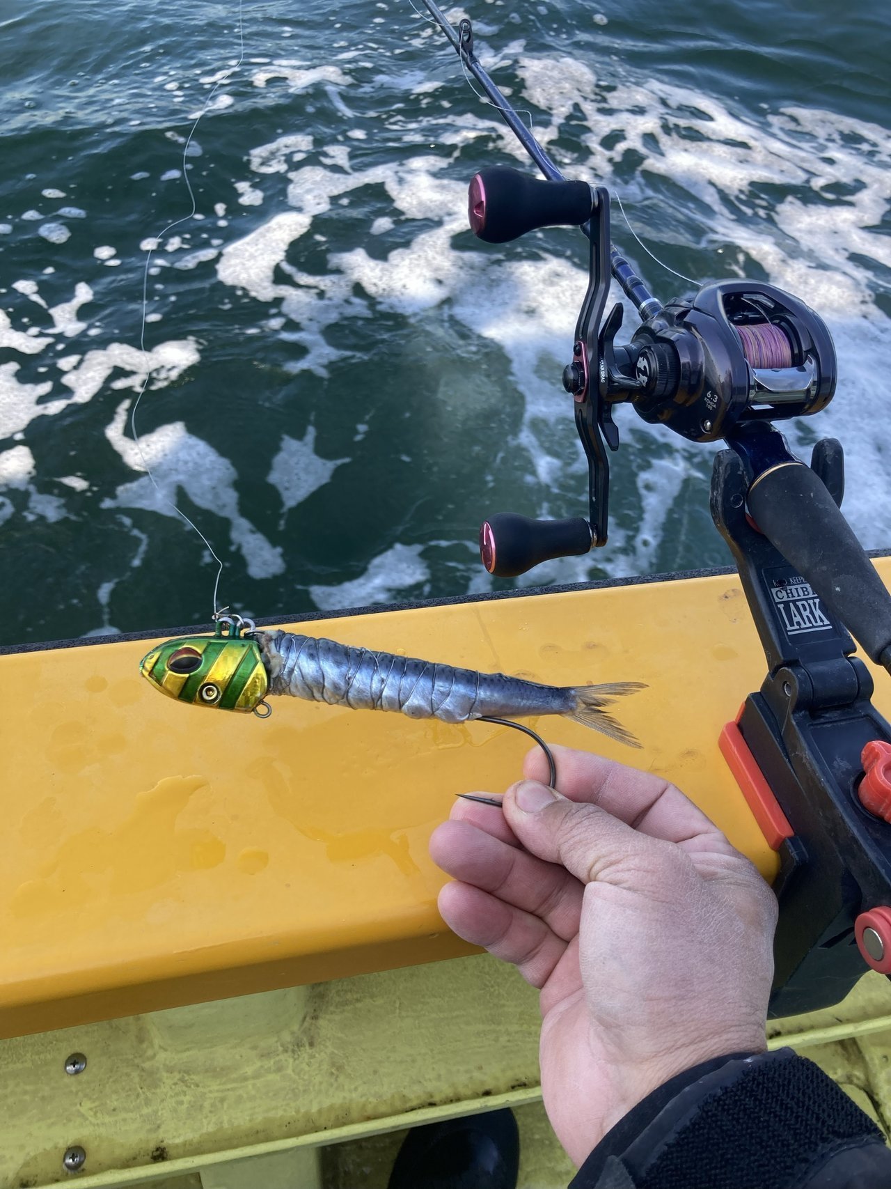 作戦はゆっくり出船してベイトの群れがたまるポイントを見つけておいてもらい合流(極寒なので)ラバージグにポークを付けてブレイクを動かさないズル引くです。