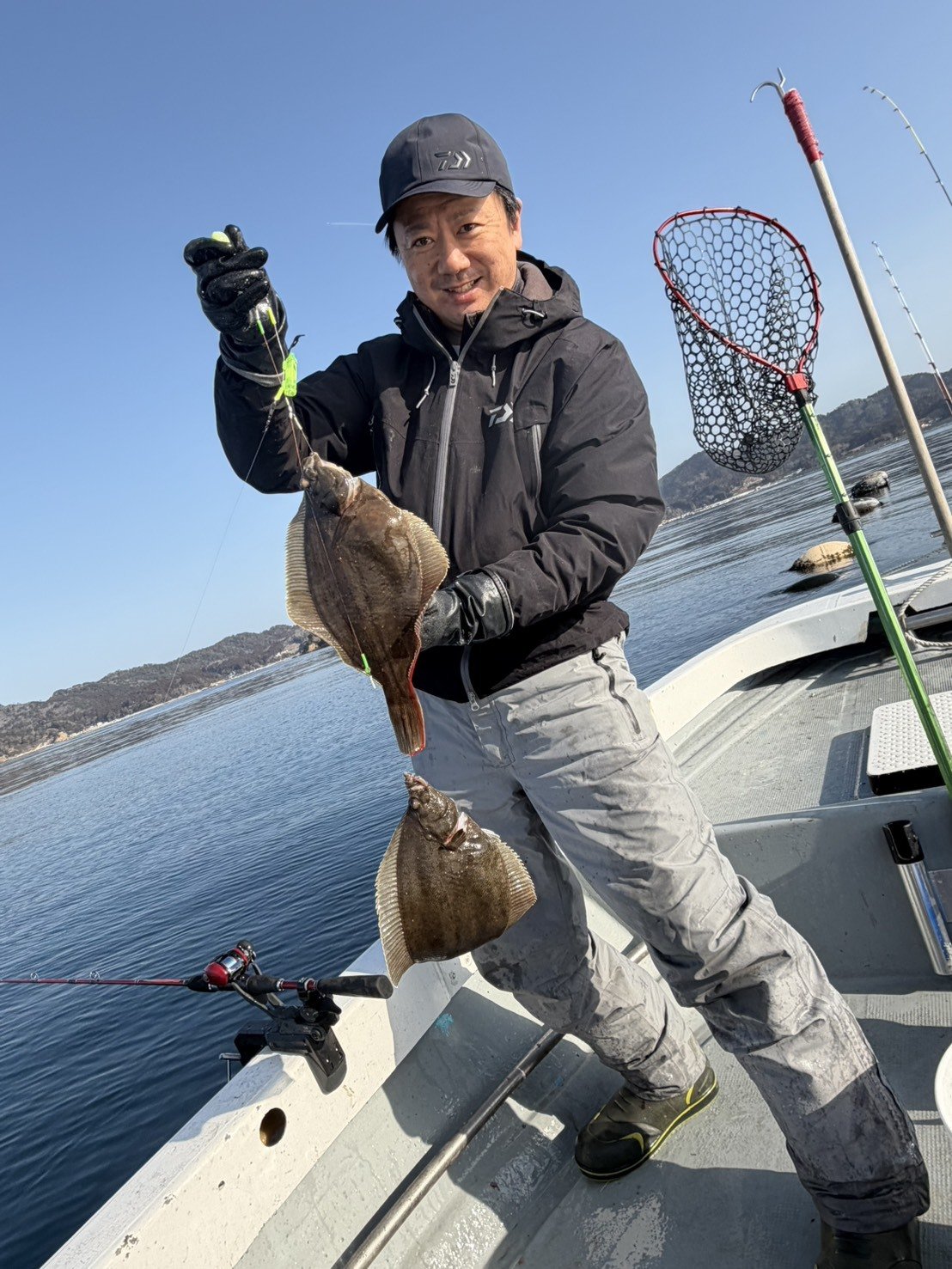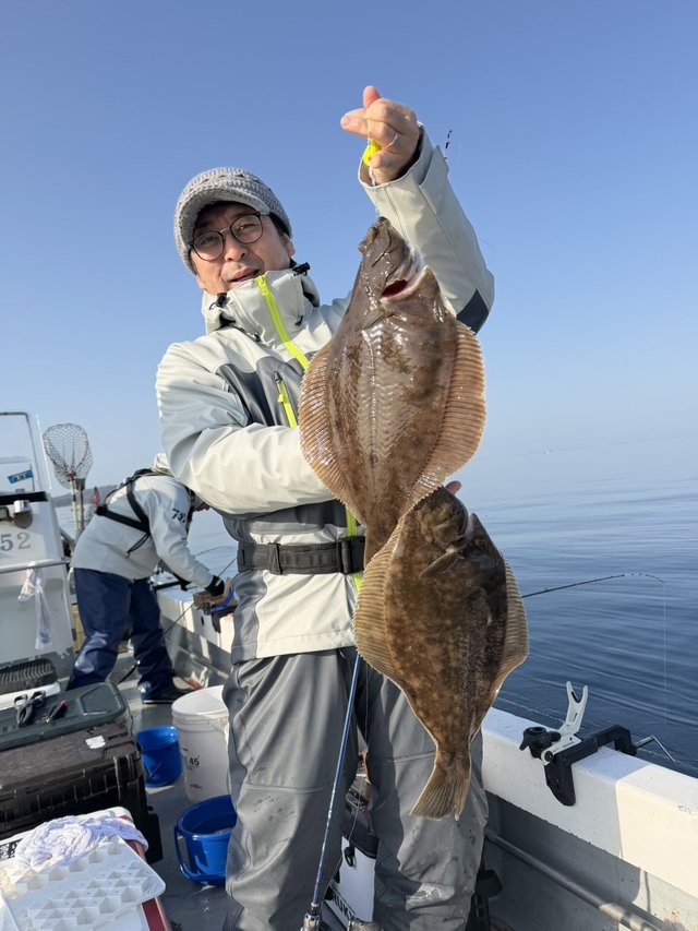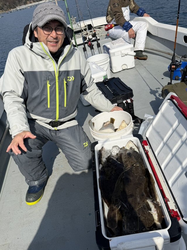 今回は快晴でベタ凪、気温も温かく春の陽気の中での釣行となりました。朝一の一投目から釣れ続き、1カ所目のポイントで、良型のマコガレイが一人10枚から20枚の釣果。その後はポイントを数カ所探りながらの釣りとなりましたが、10時頃には全員のクーラーボックスが一杯となり11時で早上がりとさせて頂きました。前回よりも肉厚なカレイが多くなっており、引きも増しているように感じました。それにしても釣れすぎる牡鹿半島周辺のマコガレイ釣り、35リッタークーラーに縦入れして詰め込んでも入りきりませんでした。釣行の際は大型クーラーをご準備下さい!!