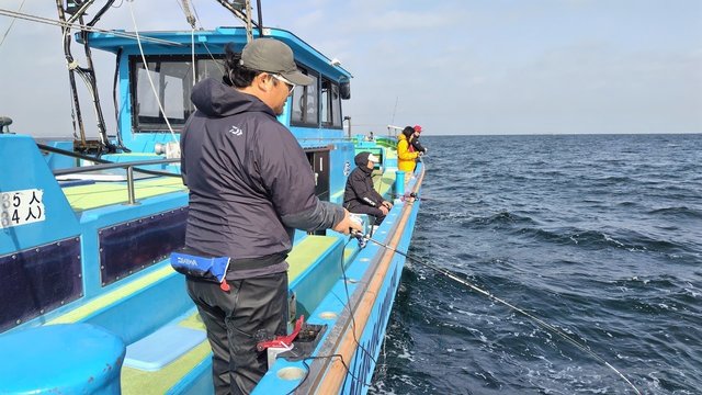 ここで反対舷の片山さんが本命ヒット!そしてまたまた隣の石川さんにアタリが出ますが、またもフッキングで乗らず。デジャブかな?水深ビタ合わせ→誘い→アタリ→掛かるのごっつぁんゴールを決めて2本目GET♪