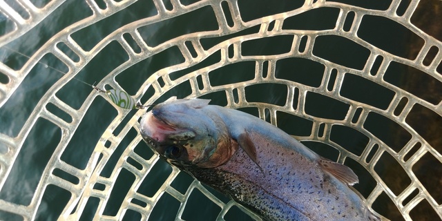 朝霞ガーデンさんにお邪魔致しました。風が無かったので暖かい中で釣り開始、2号池は中々魚も浮いておらずですが表層からスプーンで探って徐々に落として探ってみると中層上付近でようやくアタリが出ましたが同じ層を巻いてみるもアタリが出ずでしたが釣場が比較的空いていたので色々な所にキャストが出来た為、場所場所で表層にアタリが合ったり表層直下でアタリが合ったりで何とか釣れる状況。時間が経つに連れお客様も多くなって来て最後30分アタリを出せず終了となってしまいました。陽が出てる間は暖かいですが防寒対策はしっかりして行って下さいね。
