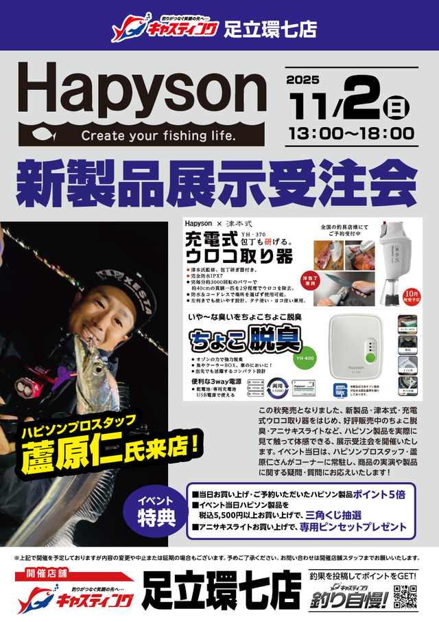 この秋発売となりました、新製品・津本式・充電式ウロコ取り器をはじめ、好評販売中のちょこ脱臭・アニサキスライトなど、ハピソン製品を実際に見て触って体感できる、展示受注会を開催いたします。イベント当日は、ハピソンプロスタッフ・蘆原仁さんがコーナーに常駐し、商品の実演や製品に関する疑問・質問にお応えいたします!