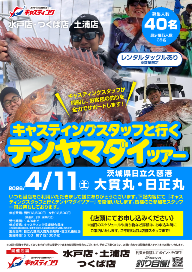 いつも当店をご利用いただきまして誠にありがとうございます。下記内容にて『キャスティングスタッフと行くテンヤマダイツアー』を開催いたします。皆様のご参加をスタッフ一同お待ちしております。