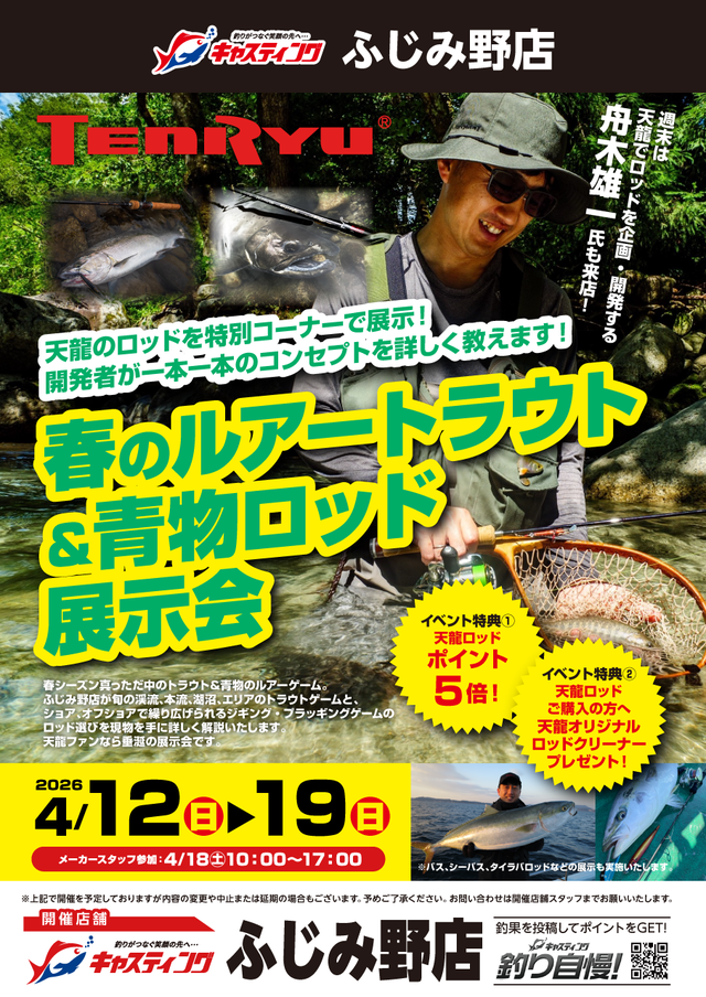 4/18(土)10:00~17:00は 天龍でロッドを企画・開発する 舟木雄一氏も来店!