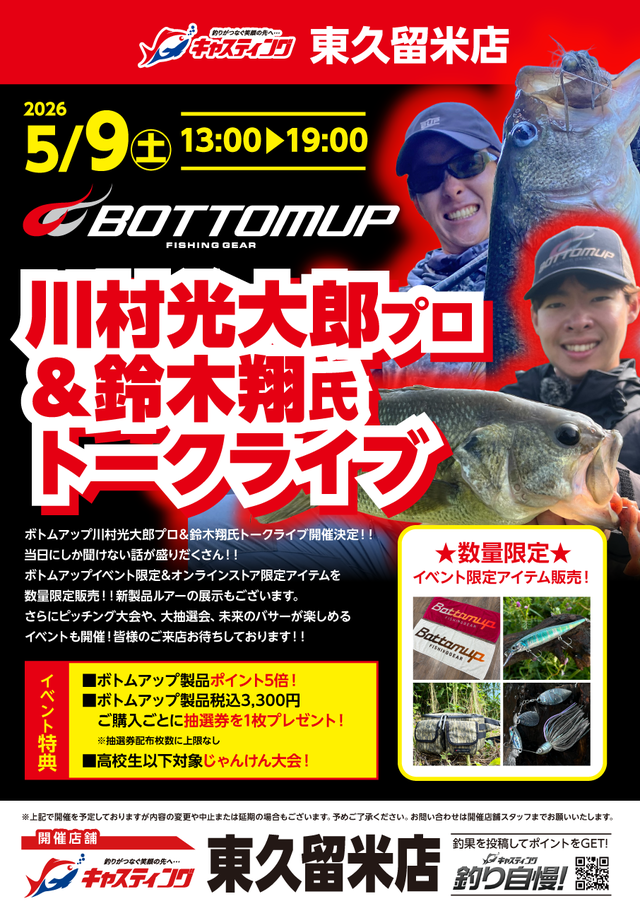 ボトムアップイベント限定&オンラインストア限定アイテムを数量限定販売!!新製品ルアーの展示もございます。