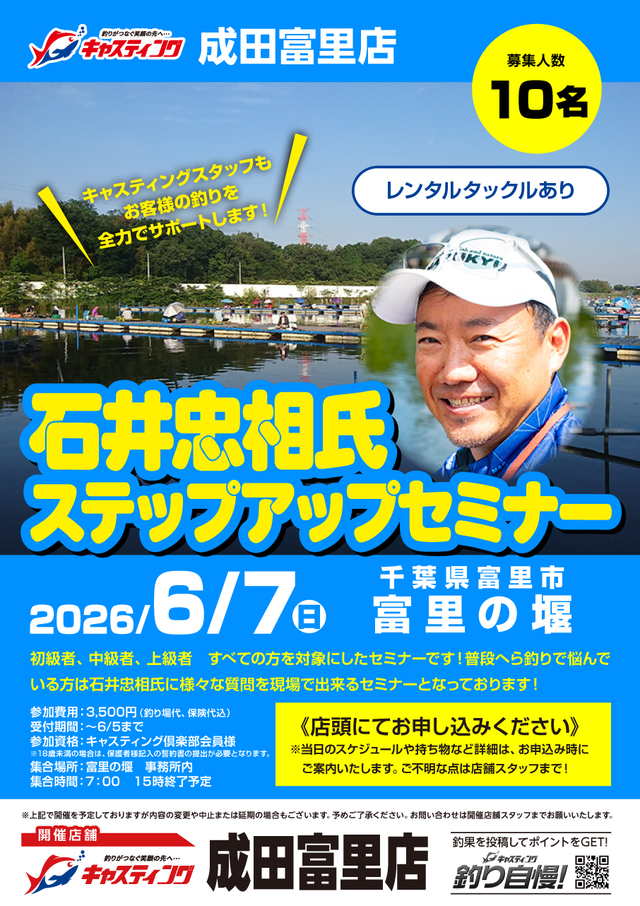 初級者、中級者、上級者 すべての方を対象にしたセミナーです!普段へら釣りで悩んでいる方は石井忠相氏に様々な質問を現場で出来るセミナーとなっております!
