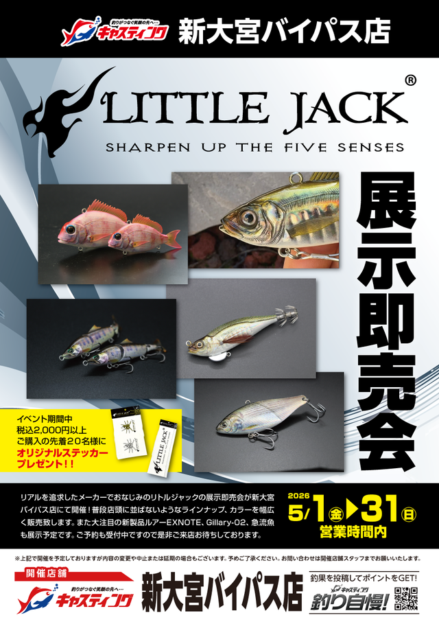 リアルを追求したメーカーでおなじみのリトルジャックの展示即売会が新大宮バイパス店にて開催!普段店頭に並ばないようなラインナップ、カラーを幅広く販売致します。また大注目の新製品ルアーEXNOTE、Gillary-02、急流魚も展示予定です。ご予約も受付中ですので是非ご来店お待ちしております。