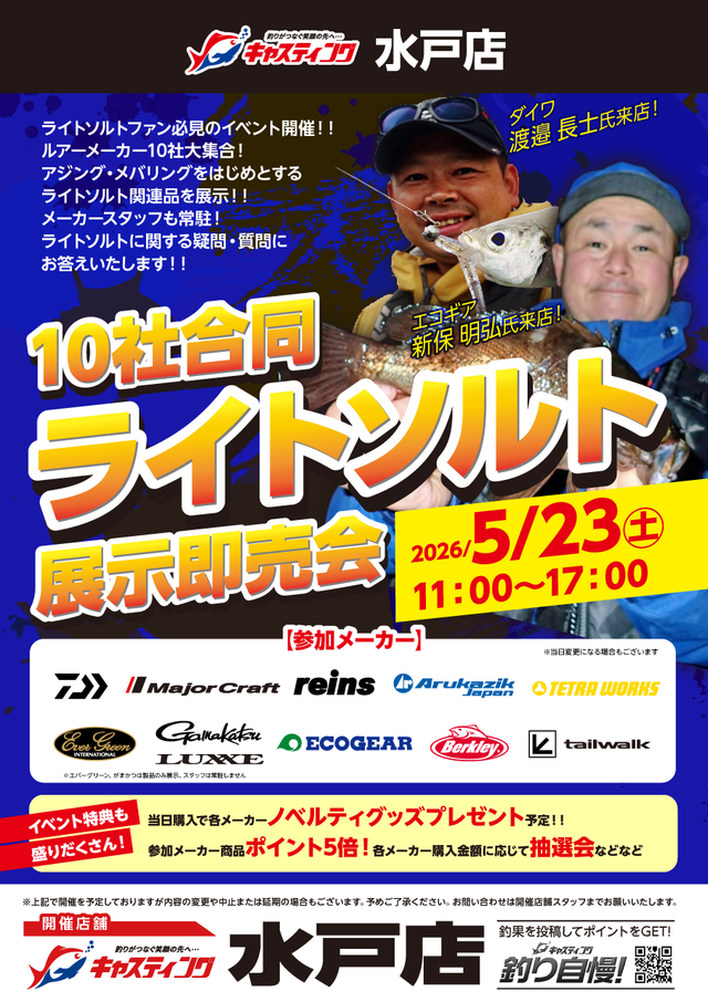 ライトソルトファン必見のイベント開催!!ルアーメーカー10社大集合!アジング・メバリングをはじめとするライトソルト関連品を展示!!メーカースタッフも常駐!ライトソルトに関する疑問・質問にお答えいたします!!