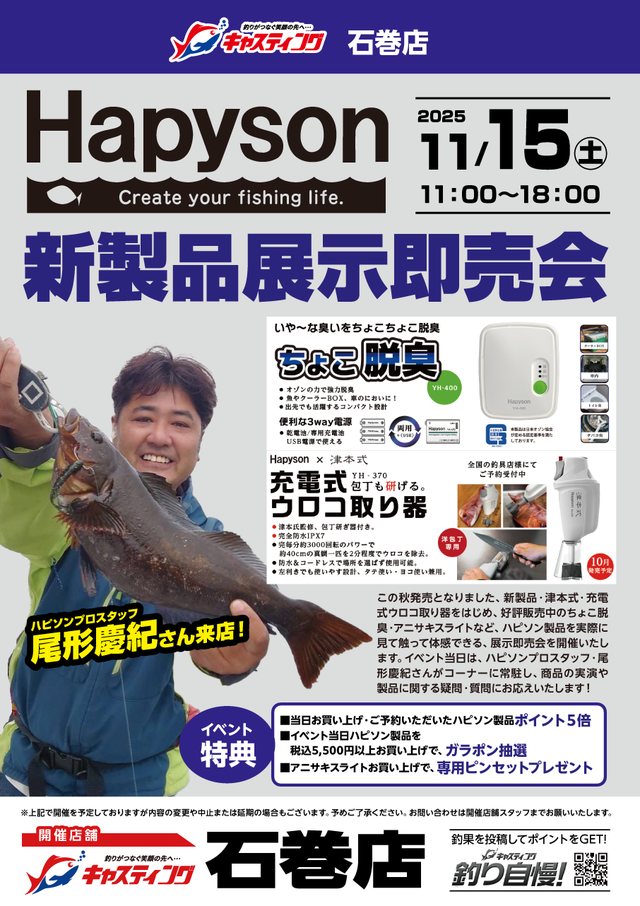 この秋発売となりました、新製品・津本式・充電式ウロコ取り器をはじめ、好評販売中のちょこ脱臭・アニサキスライトなど、ハピソン製品を実際に見て触って体感できる、展示即売会を開催いたします。イベント当日は、ハピソンプロスタッフ・尾形慶紀さんがコーナーに常駐し、商品の実演や製品に関する疑問・質問にお応えいたします!